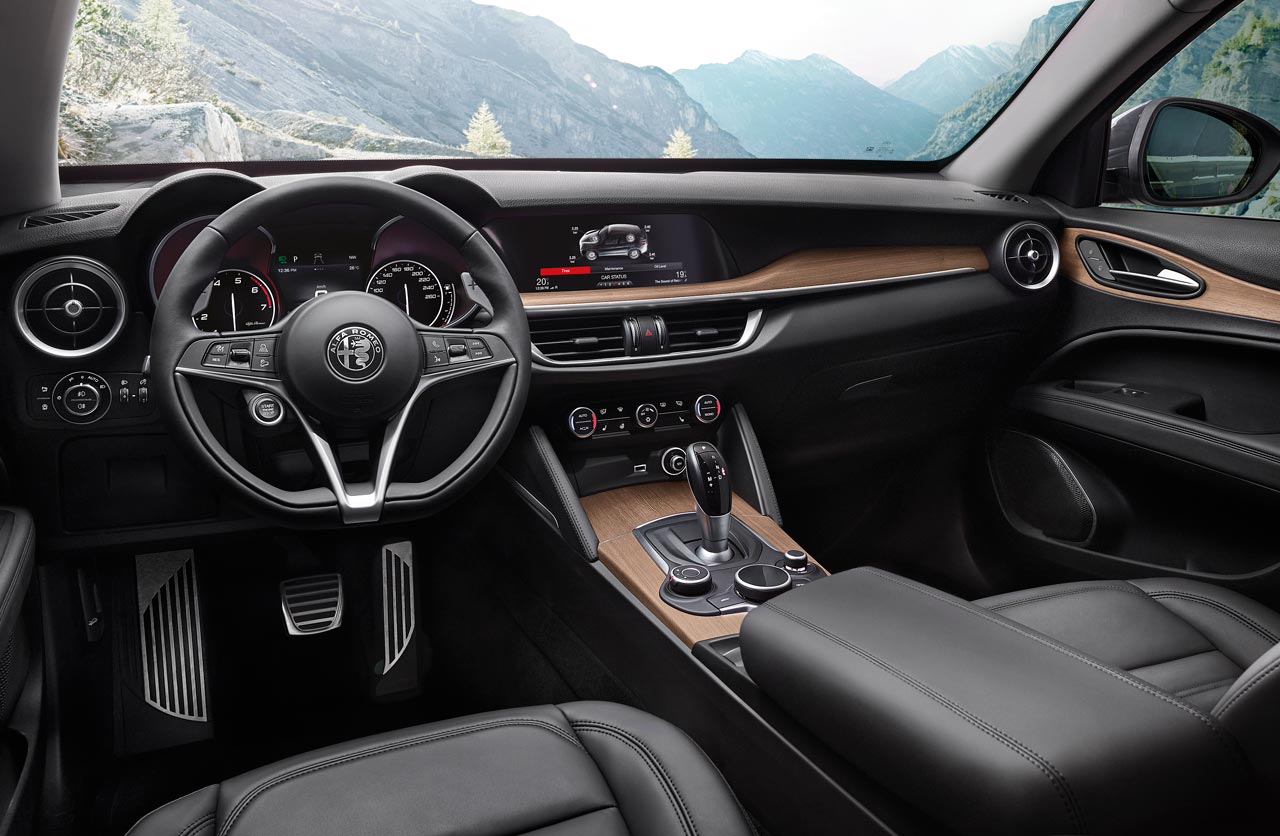 En el interior, el primer SUV de Alfa se destaca por el diseño moderno de la plancha de a bordo y el tablero de instrumentos, que se combinan con el volante deportivo que incluye botón de encendido y levas de caja de aluminio.