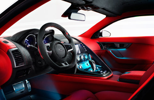 En el interior predomina un cuero de gran calidad y la elección del rojo bermellón para decorarlo. Como se puede esperar en un Jaguar, se han utilizado materiales premium en todas las partes, como las superficies principales de contacto compuestas por una combinación de aluminio, Piano Black, cromo oscuro y fibra de carbono que enfatizan su potencial deportivo. Los asientos ajustables manualmente están hechos de materiales compuestos con una columna de fibra de carbono para aumentar su rigidez y soporte. Los controles de la consola están inspirados en la ergonomía aeronáutica, como la palanca de cambios estilo joystick e interruptores que también hacen referencia a los clásicos de la marca inglesa.
