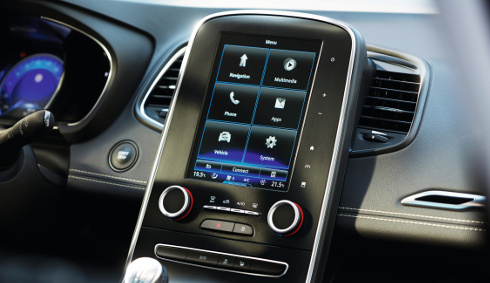 En el habitáculo, el nuevo Scénic recurre a un diseño moderno con una consola central “flotante” que aloja a la pantalla táctil a color de 8,7″ (similar a la del Mégane) para el sistema multimedia R-Link 2, configuración para cinco pasajeros y baúl con una capacidad de 572 litros.