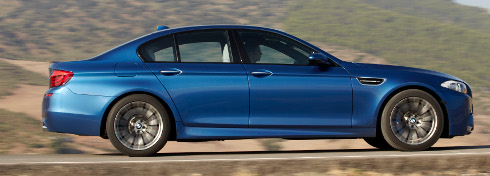 Dispone de un chasis ultraliviano que incluye amortiguadores regulados electrónicamente, dirección Servotronic M, sistema de regulación de la estabilidad con modo M Dynamic y sistema de frenos de alto rendimiento de material compuesto. La gran distancia entre ejes, el habitáculo desplazado hacia atrás y los marcos de las ventanas laterales de color negro brillante acentúan la alargada silueta del nuevo BMW M5. Los musculosos pasaruedas, el menor despeje del piso y las llantas de 19 pulgadas con radios dobles realzan el carácter deportivo del diseño lateral.