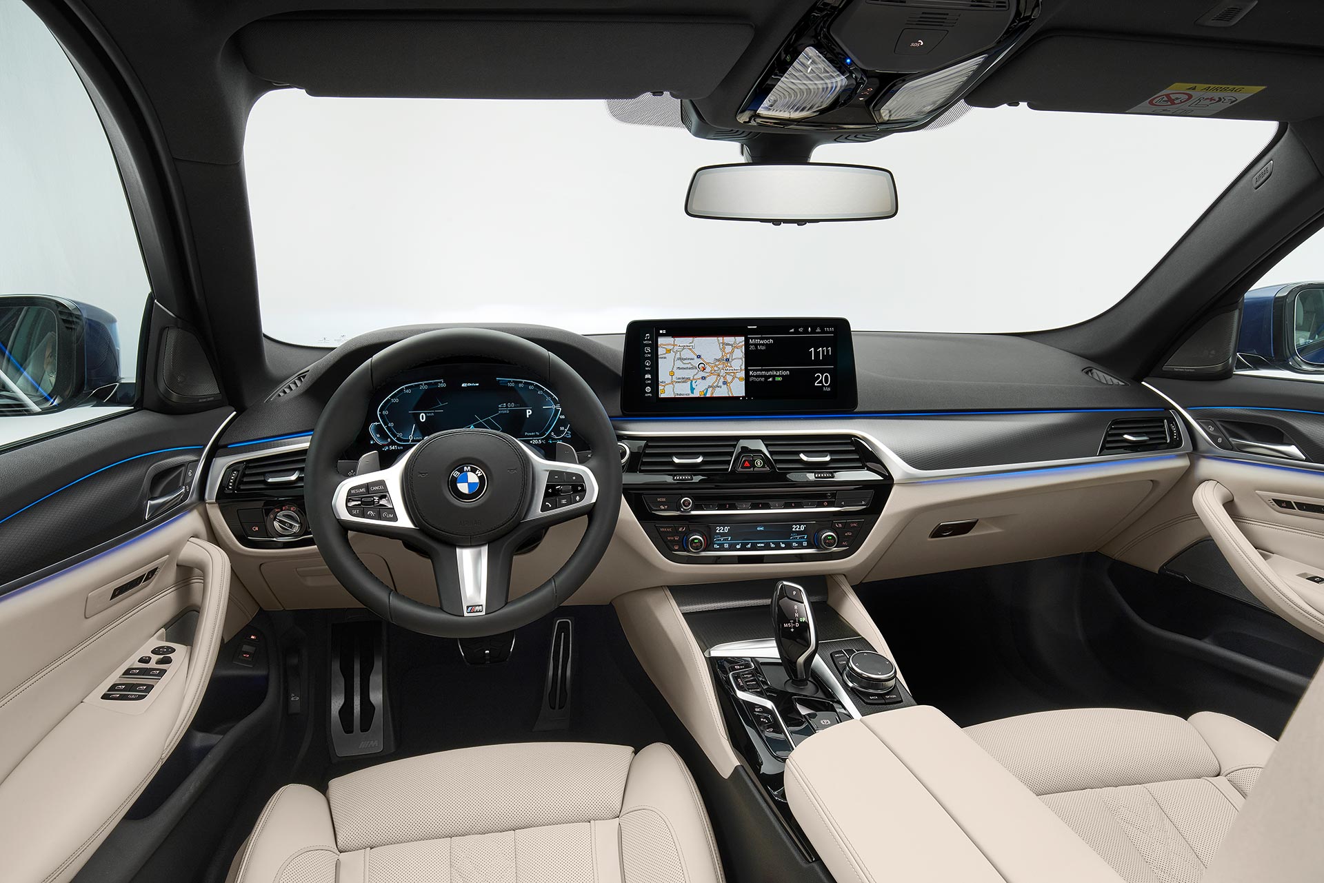 En el interior, el renovado Serie 5 posee cambios en el volante, nuevos asientos multifuncionales M y flamantes molduras. Además, incorpora un tablero con pantalla de 12,3 pulgadas y un equipamiento que incluye una cámara de grabación de la conducción, nuevo sistema de navegación basado en la nube, asistente de estacionamiento con función de marcha atrás y nuevas asistencias a la conducción, como la función de retorno al carril y la visualización en 3D del entorno.
