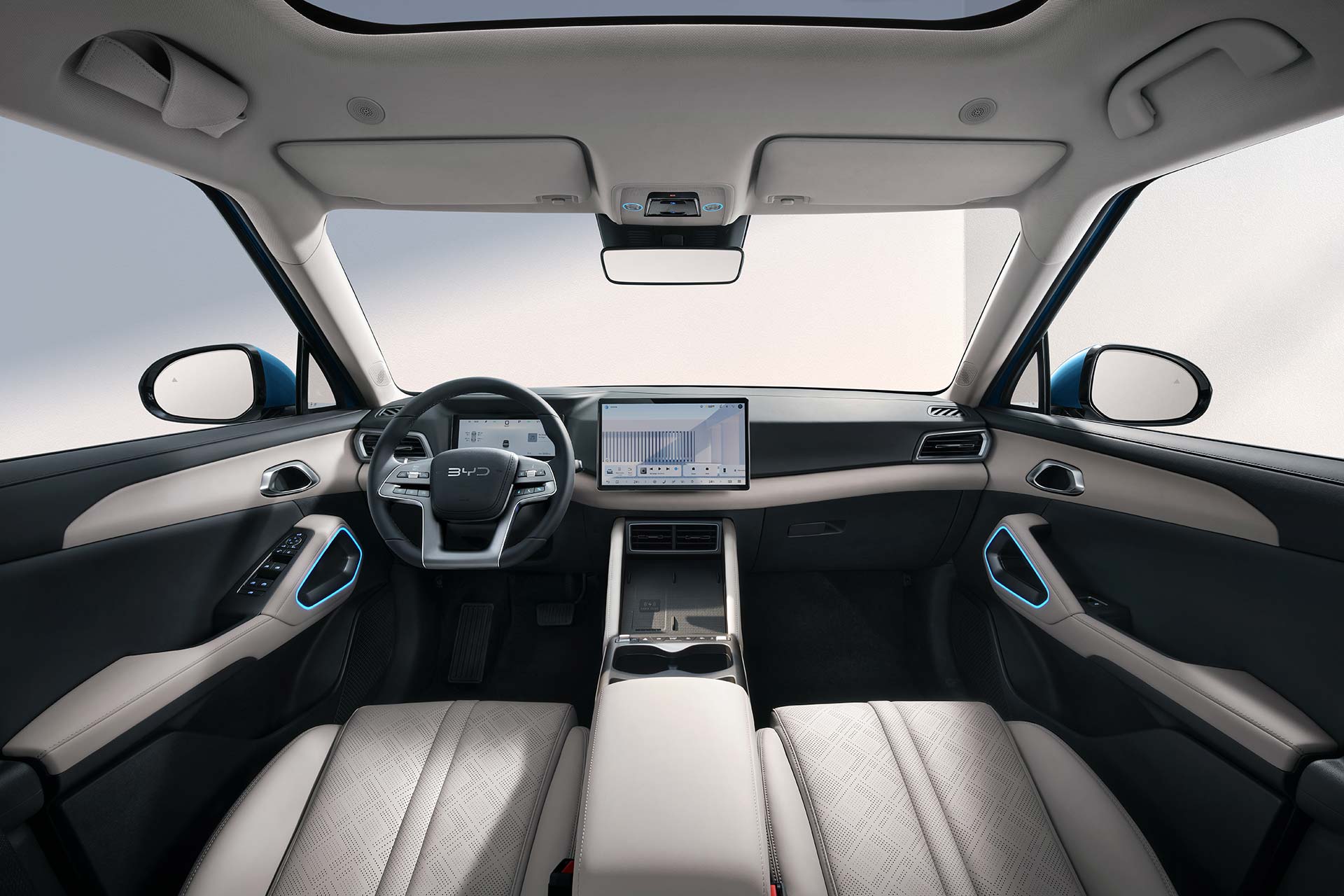 En el interior incluye un piso totalmente plano y un baúl con 425 litros de capacidad. Además, hay tablero digital de 8.8”, pantalla multimedia de 12.8”, techo solar panorámico, asientos eléctricos, el último software de BYD y dos opciones de color para el tapizado similar al cuero: Black y Gravel Beige.