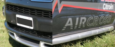 Sobre esta base, el C3 Aircross reúne todos los elementos propios del mundo off-road moderno como la inmensa boca delantera atravesada por un grueso barral longitudinal. Acompañan las dos generosas entradas laterales que contienen los voluminosos porta rompenieblas en posición alta, para proteger mejor sus cristales. En los dos frentes y los laterales, la sección baja ofrece molduras en tono metalizado. Todo el perímetro lleva una franja en plástico negro, incluyendo los guardabarros.