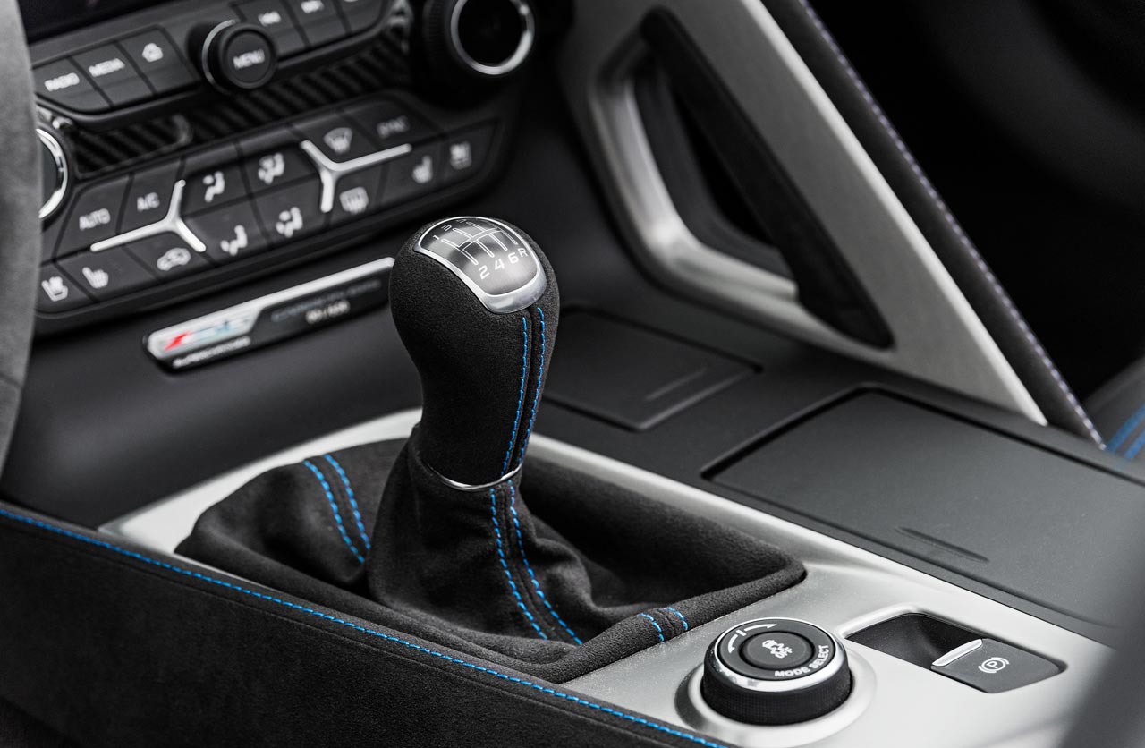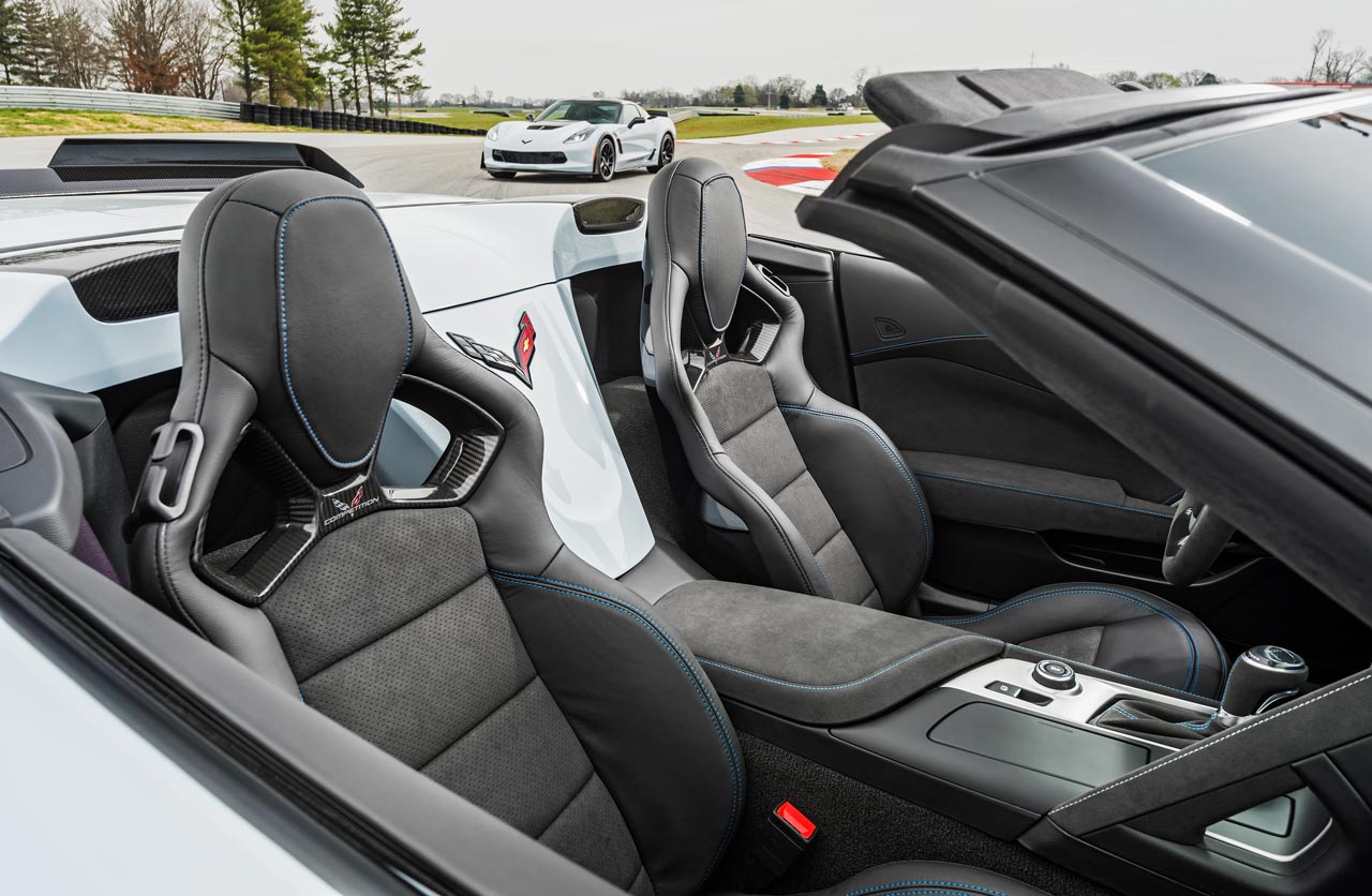 En el interior, este Corvette especial cuenta con tapizado de cuero negro con costuras azules, apliques de fibra de carbono brillante, butacas de competición y volante con borde de fibra de carbono.