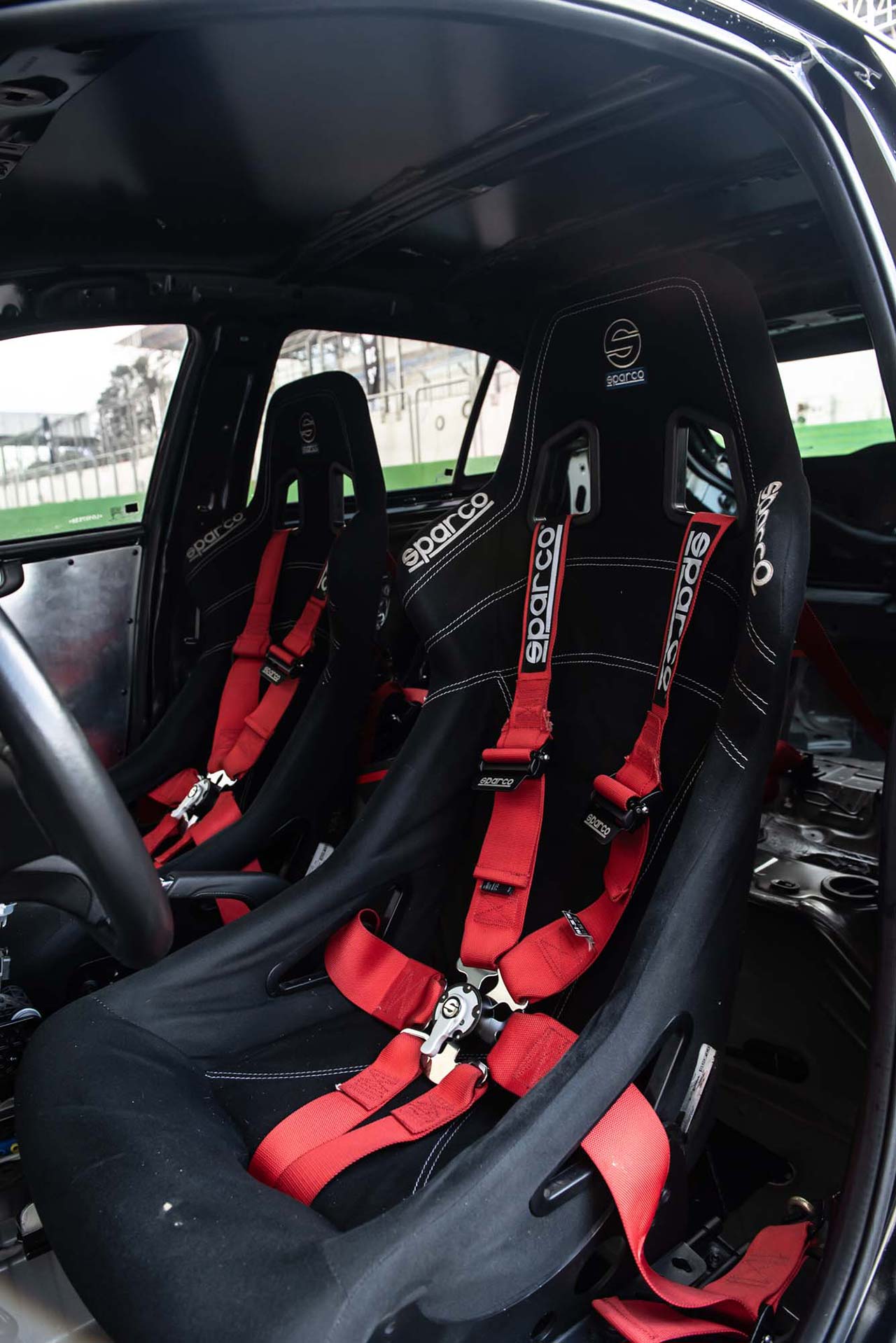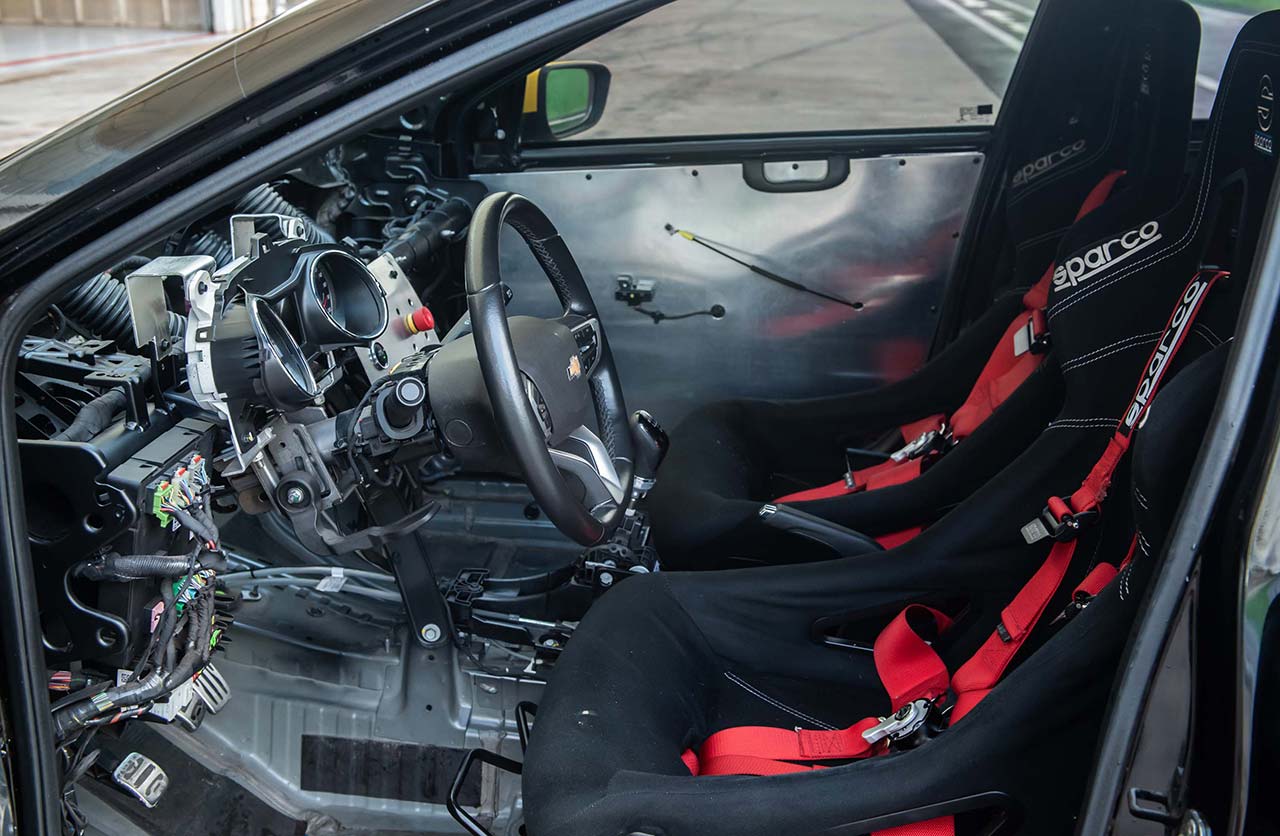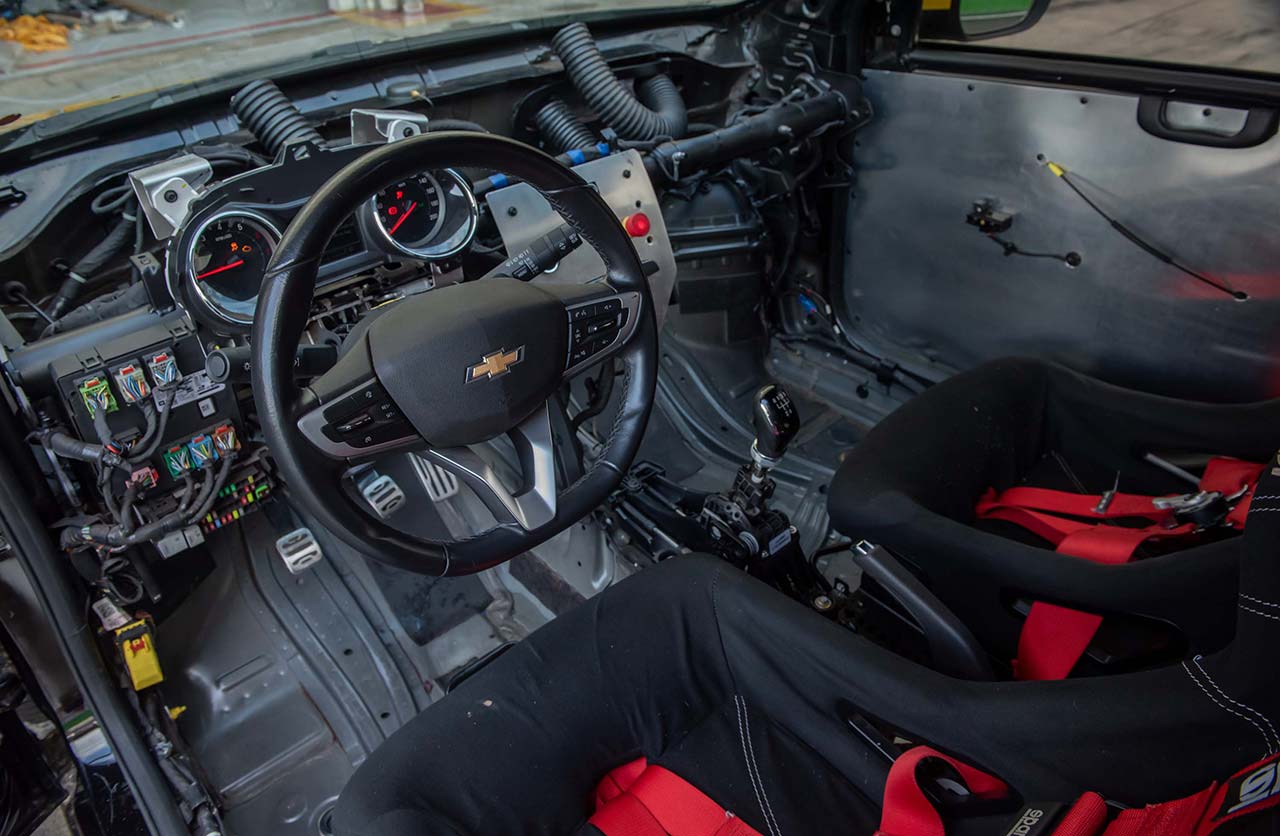 Puertas adentro, el concepto también se aleja del Onix de producción. El interior fue aliviando mediante la eliminación de paneles y tapizados y la incorporación de butacas tipo competición con cinturones de cinco puntos, lo que permitió reducir alrededor de 150 kilos el peso total del vehículo.
