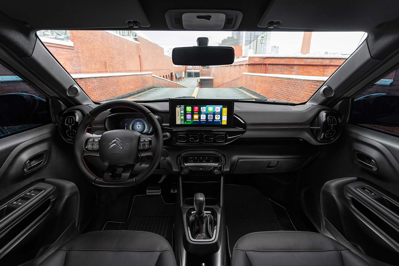Las novedades continúan en el interior, donde posee una configuración totalmente oscurecida con tapizados de tela negros con costuras rojas, estas últimas también presentes en el selector de caja negro brillante.