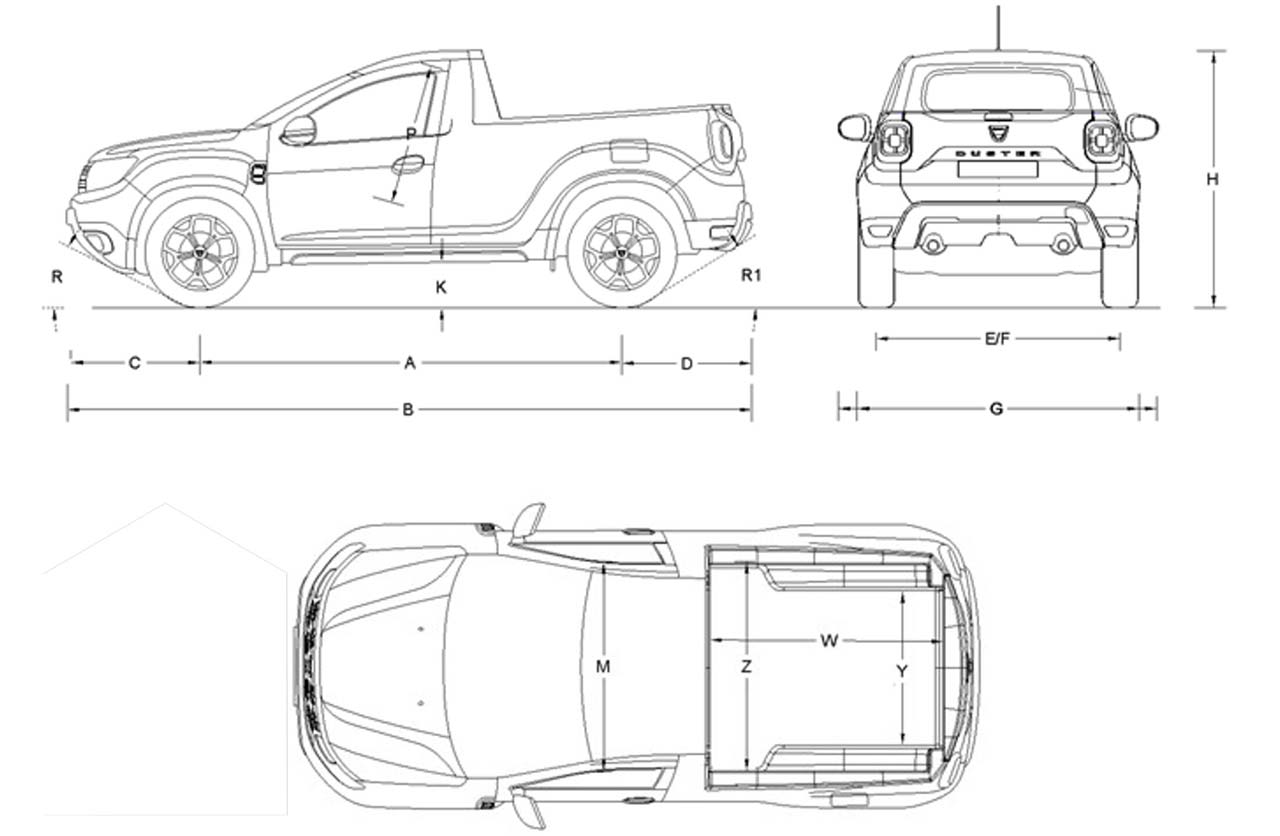 La camioneta posee 4,34 metros de largo y una caja de carga con 1,65 de longitud (la Duster Oroch basada en la primera generación tiene 1,35) y hasta 1,35 de ancho (1,17). Además, posee un portón trasero con el diseño heredado del SUV.