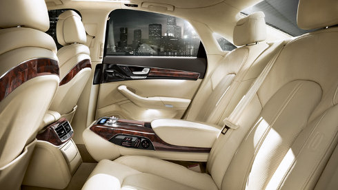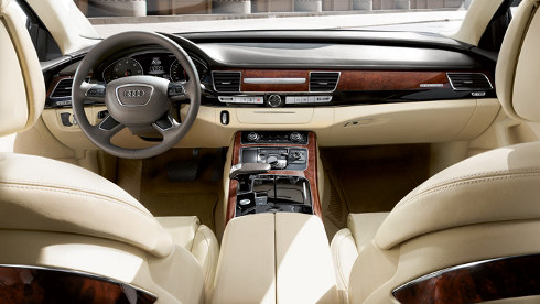 El interior es muy espacioso y completo, al mejor estilo Audi. Con inserciones de madera de raíz de nogal, y molduras de aluminio, el lujo se deja ver en cada detalle. Cuenta con techo corredizo eléctrico, sistema MMI con pantalla color de 8″, interfaz bluetooth, climatizador de cuatro zonas con comandos delanteros y traseros, asientos tapizados en cuero, calefactables, con función masaje, y delanteros con ajuste lumbar y función de memoria. El nuevo A8 largo posee volante deportivo de cuero multifunción en diseño de 3 radios con levas de cambio y regulación axial eléctrica e inclinación ajustable. Las llantas son de aluminio forjado 9J x 19″ en diseño de 10 radios en Y.
