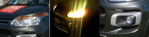 Una vez despejado el parabrisas, hay que analizar el trabajo de los faros delanteros. Además del formato atractivo, se aprecia que Citroën invirtió tiempo y dinero en hacer atractiva la disposición interna. Envuelto todo en un fondo cromado, las luces bajas encienden el cuerpo central que parece estar flotando. Las luces altas utilizan el cuerpo principal y las de giro la sección superior en amarillo.