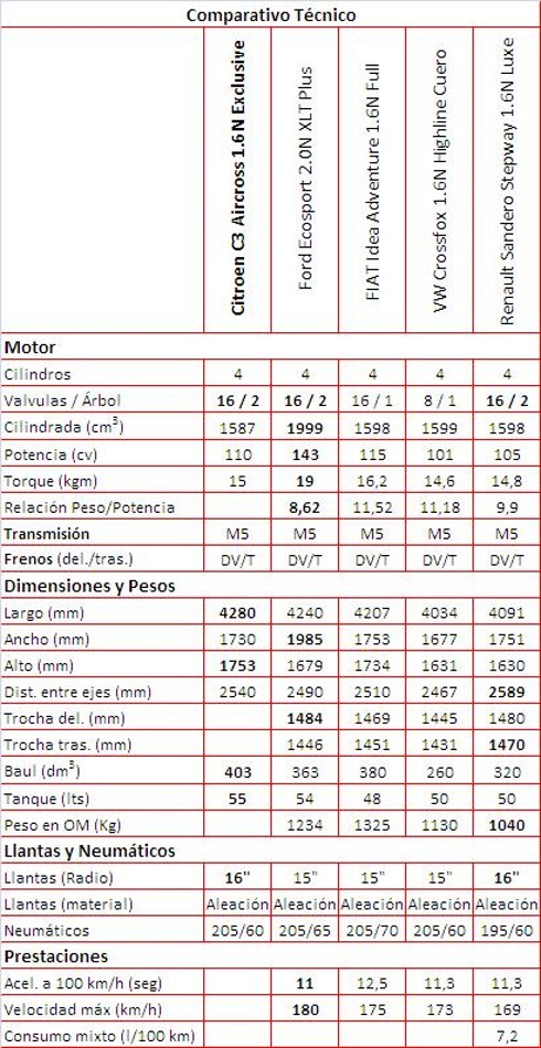 Los autos seleccionados para este análisis comparativo con el Citroën C3 Aircross 1.6L Exclusive ($ 95.725) son los: Ford EcoSport 2.0L XLT Plus 4×2 ($ 93.950), FIAT Idea Adventure 1.6L Full ($ 93.050), VW Crossfox 1.6L Highline Cuero ($ 87.927) y al Renault Sandero Stepway 1.6L Luxe ($ 83.100).