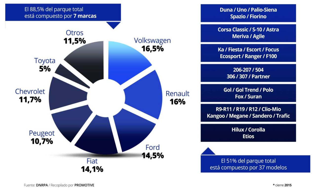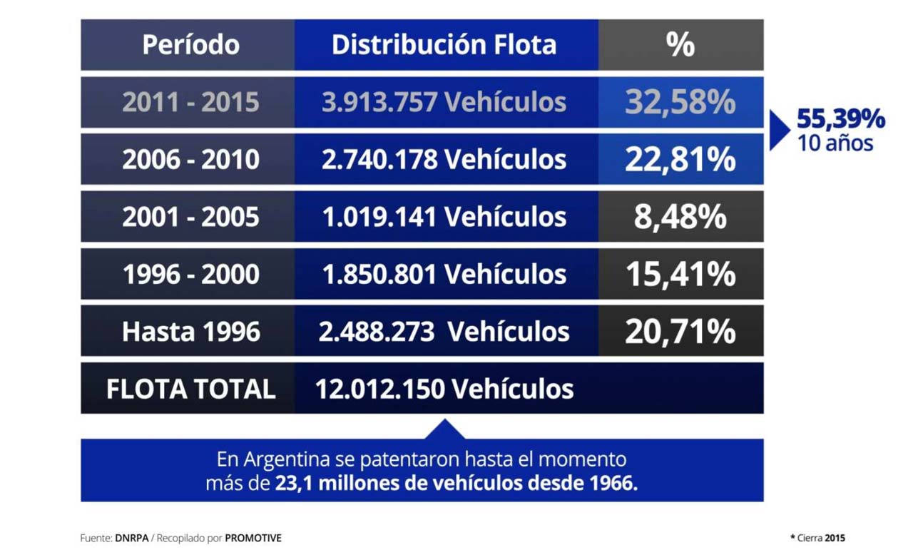 La flota circulante en Argentina, tomando en cuenta automóviles, comerciales livianos y pesados, alcanzó los 12.012.150 vehículos a finales de 2015. La misma, al cierre del año 2014, estaba compuesta por un total de 11.520.380 vehículos, lo que representa una suba del 4,3%.