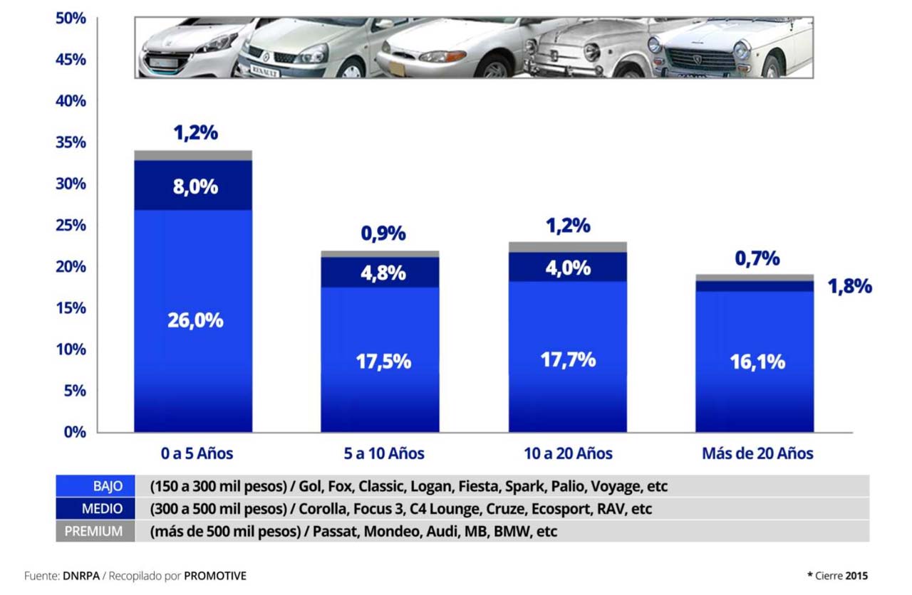 El parque “vivo” automotor fue clasificado por tipo de combustible, ubicación geográfica, marcas y antigüedad por segmento.