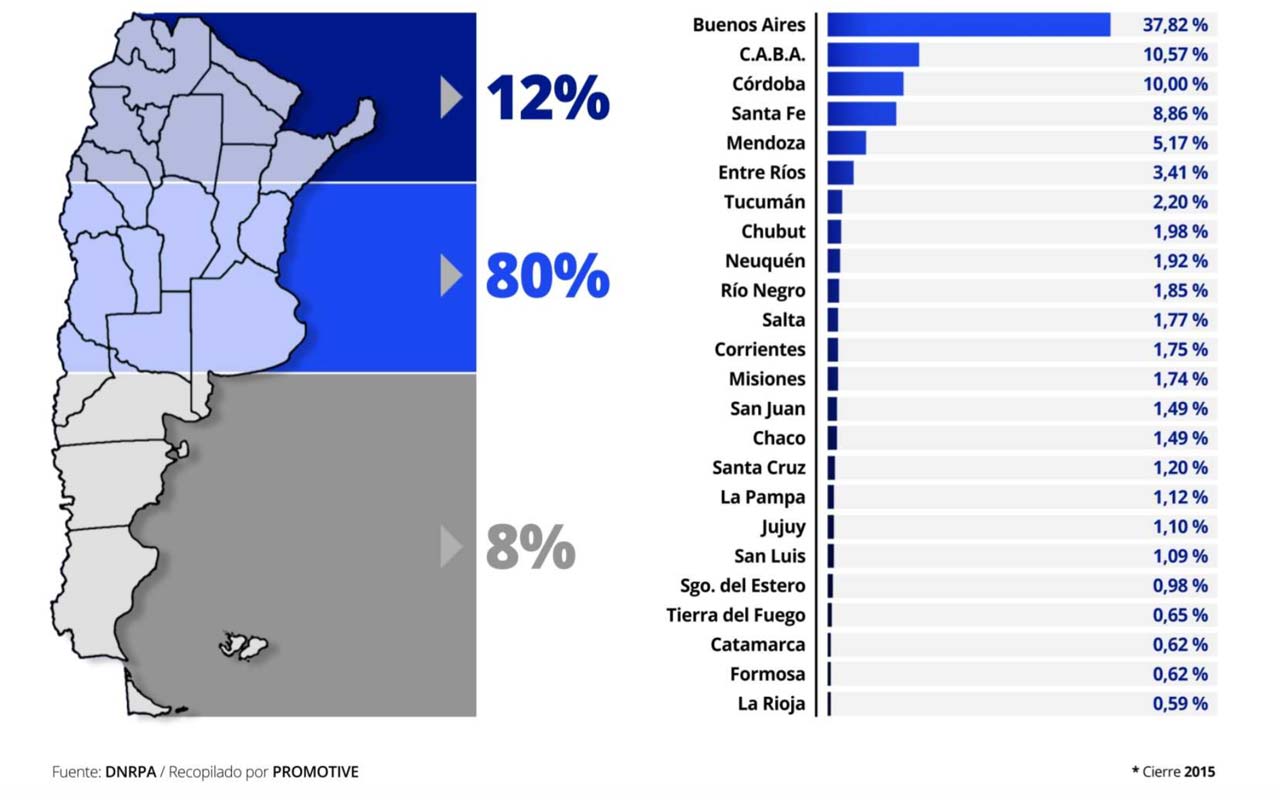 Más del 48% de la flota se encuentra concentrada en la Provincia de Buenos Aires y la Ciudad Autónoma de Buenos Aires, seguidas por Córdoba y Santa Fe que en conjunto suman 18,86%.