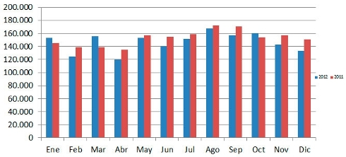En el mes de diciembre la cifra fue de 133.342 unidades, una caída del 11,55% con respecto a igual mes de 2011 donde se habían comercializado 150.756 unidades.