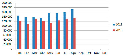 En los primeros 8 meses del año se comercializaron 1.200.899 unidades, un crecimiento del 21,92% con respecto a igual período de 2010, cuando se vendieron 984.950 unidades. Si comparamos el mes de agosto (172.323 unidades), con el mes de julio (158.818 unidades), la suba fue de 8,50%.