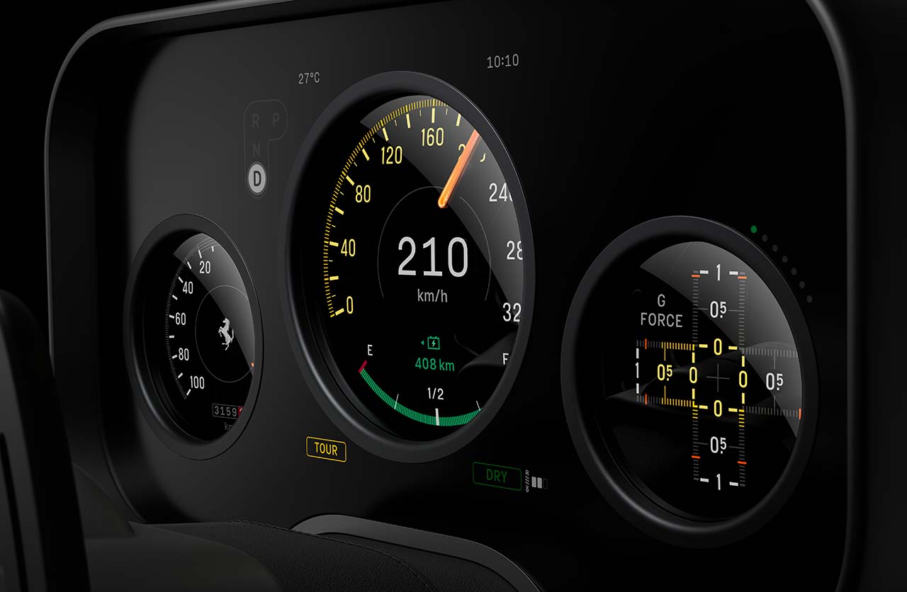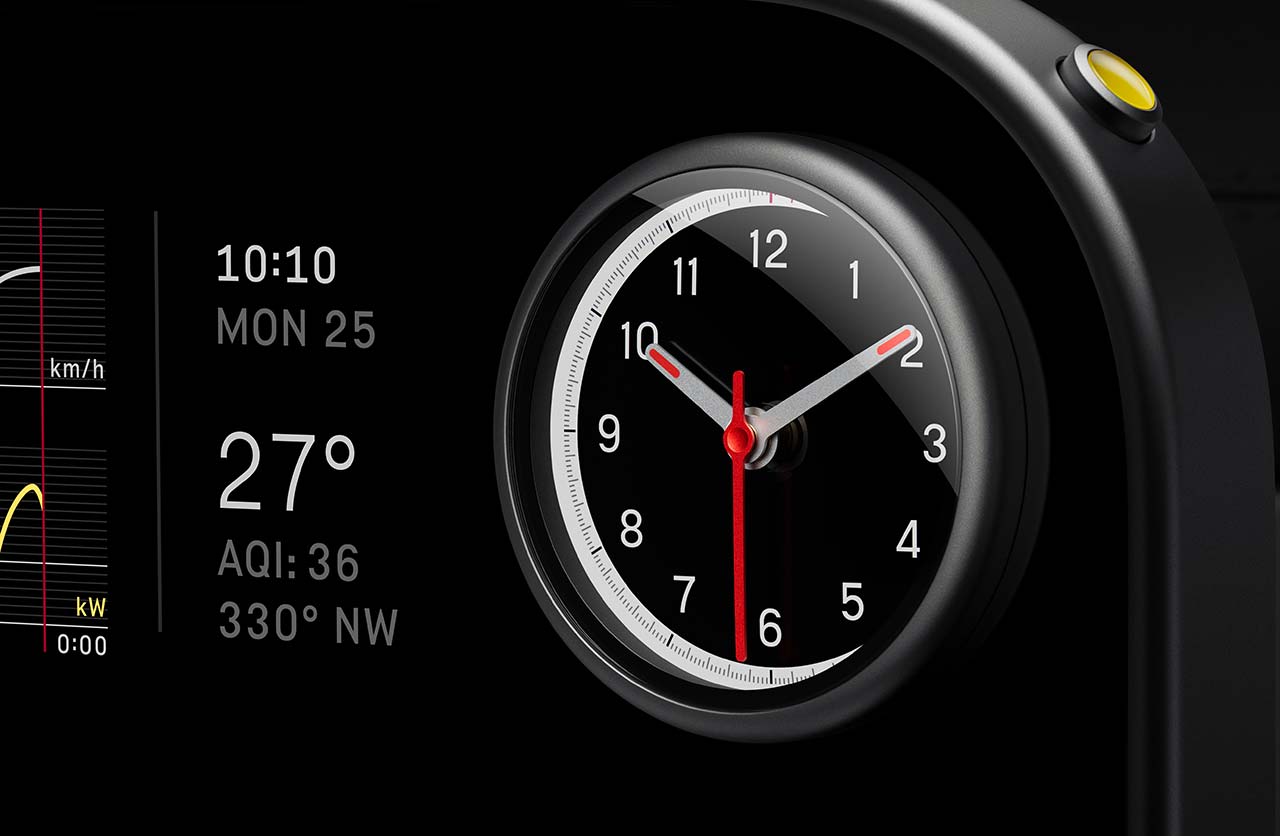 El tablero está acompañado por un novedoso panel de control móvil que permite orientar su pantalla hacia el conductor o hacia el pasajero. A eso se suma un reloj cubierto con Corning Gorilla Glass, un vidrio que se destaca por su durabilidad y resistencia. Incluye agujas movidas por tres motores y también ofrece funciones de cronógrafo, brújula y control de lanzamiento.