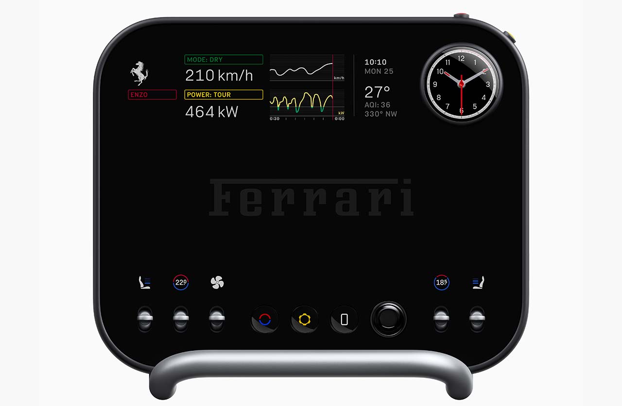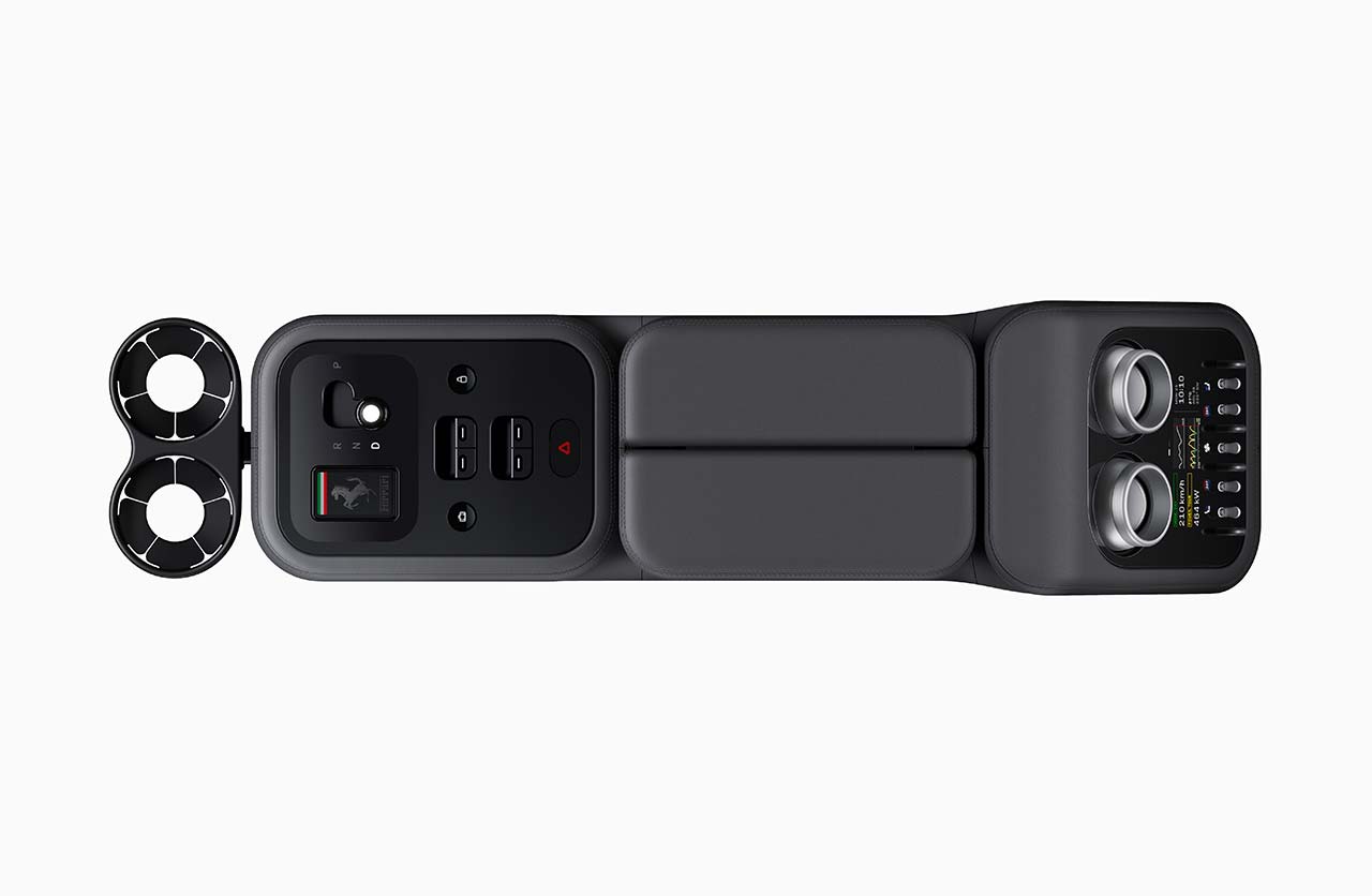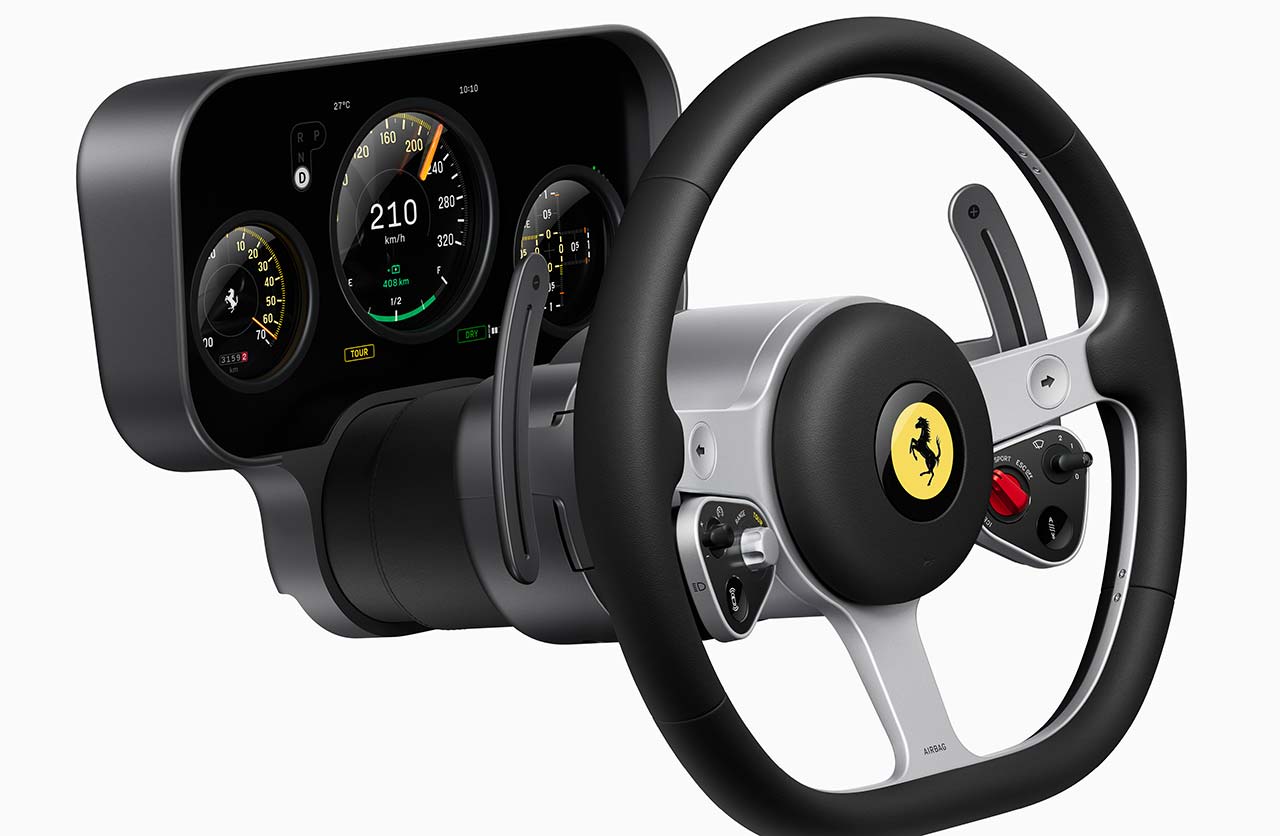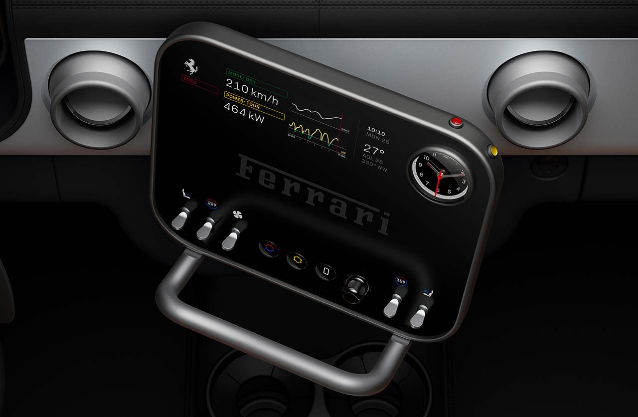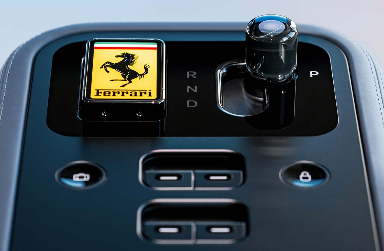 Ferrari además mostró otros comandos del puesto de conducción y la llamativa llave fabricada con Corning Gorilla Glass y pantalla de tinta electrónica (E Ink).