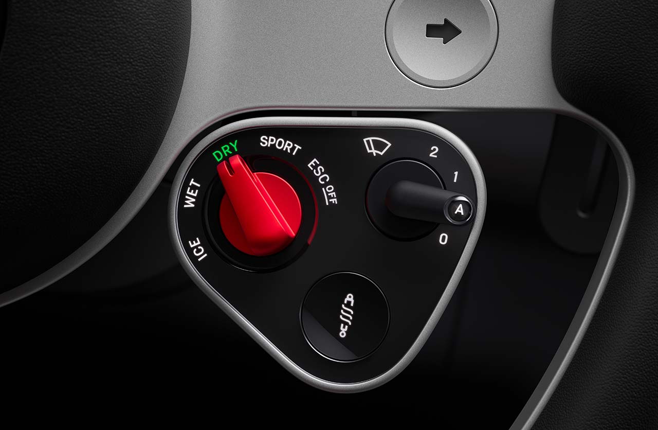 También con aspecto retro, el tablero de instrumentos está montado en la columna de dirección y se mueve junto al volante, para optimizar la visión del conductor. Posee dos pantallas OLED superpuestas y combina elementos digitales y analógicos.