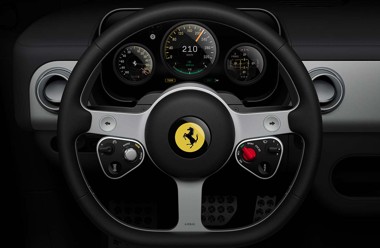 Entre sus novedades, el habitáculo cuenta con un volante que homenajea a la herencia de la marca. Posee una forma simplificada de tres radios, una reinterpretación del volante Nardi de madera de las décadas del 50 y el 60. Producido en aluminio reciclado, incluye controles en dos módulos de control analógicos.