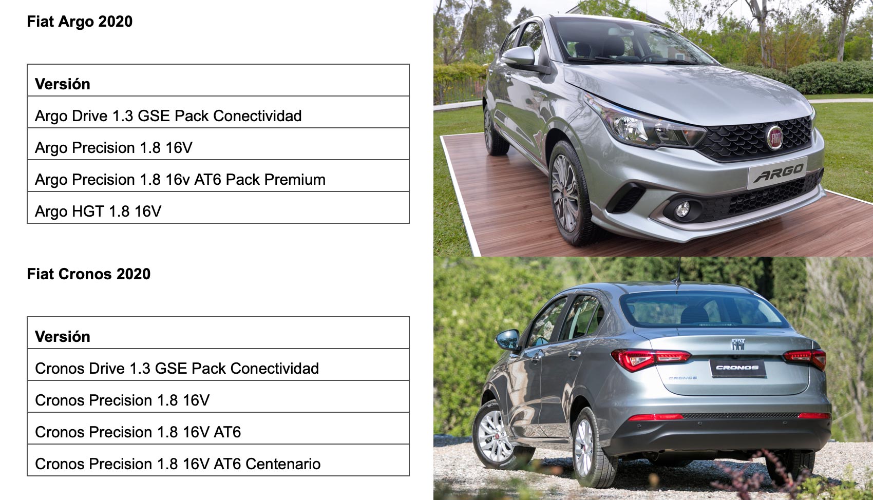 Con una garantía de 3 años o 100.000 kilómetros, los precios sugeridos al público de la gama 2020 de los Fiat Argo y Cronos queda como sigue (consultar por bonificaciones vigentes):