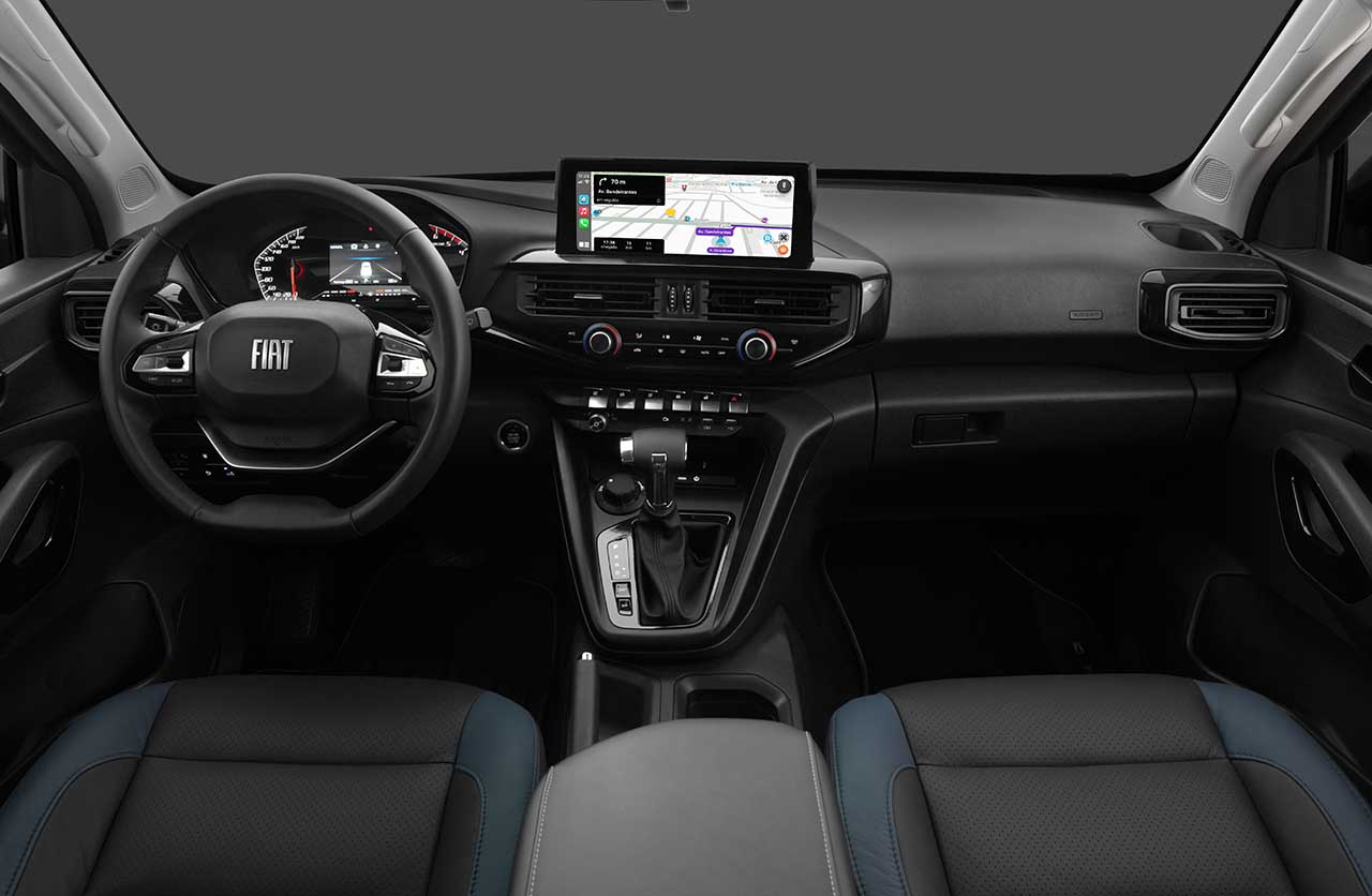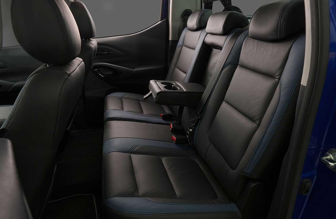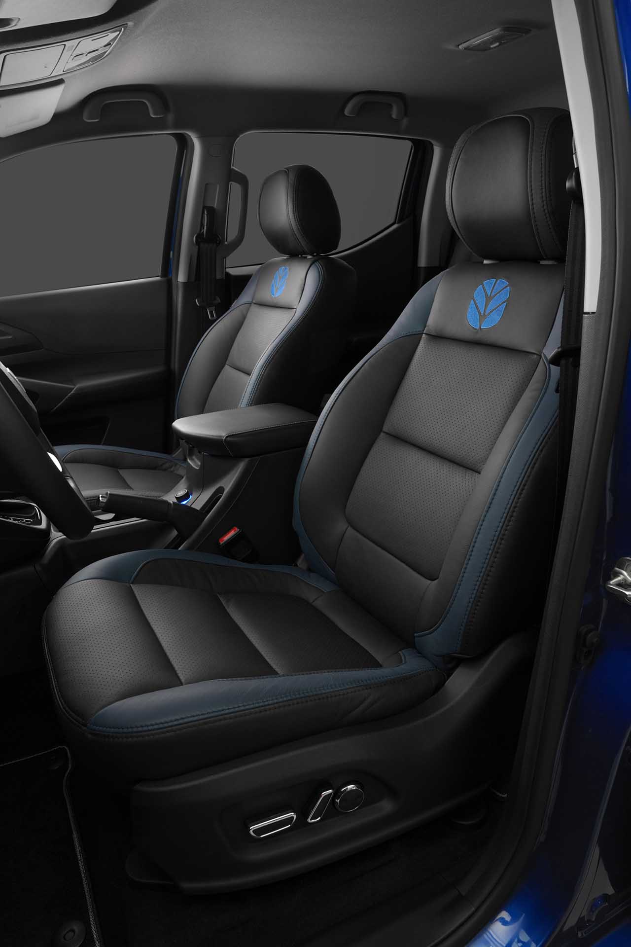 Puertas adentro, esta pick up cuenta con el diseño conocido, ahora acompañado por un tapizado de cuero específico que combina el color azul con el logotipo de New Holland.