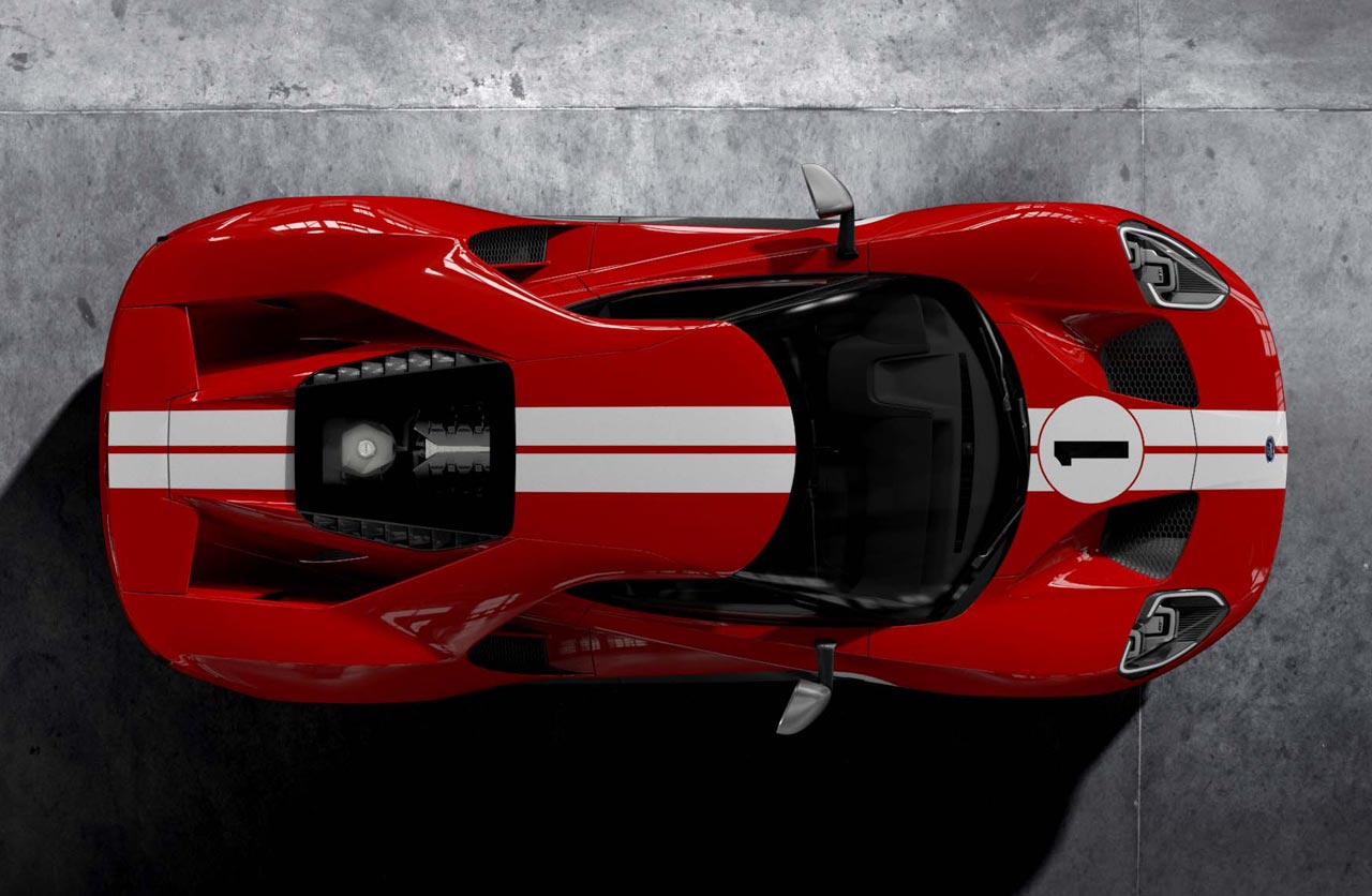 El Ford GT modelo ‘67 Heritage presenta una impactante carrocería color roja brillante “Race”, con rayas blancas, piezas de fibras de carbono y un número 1 estampado en sus laterales y en el capó.