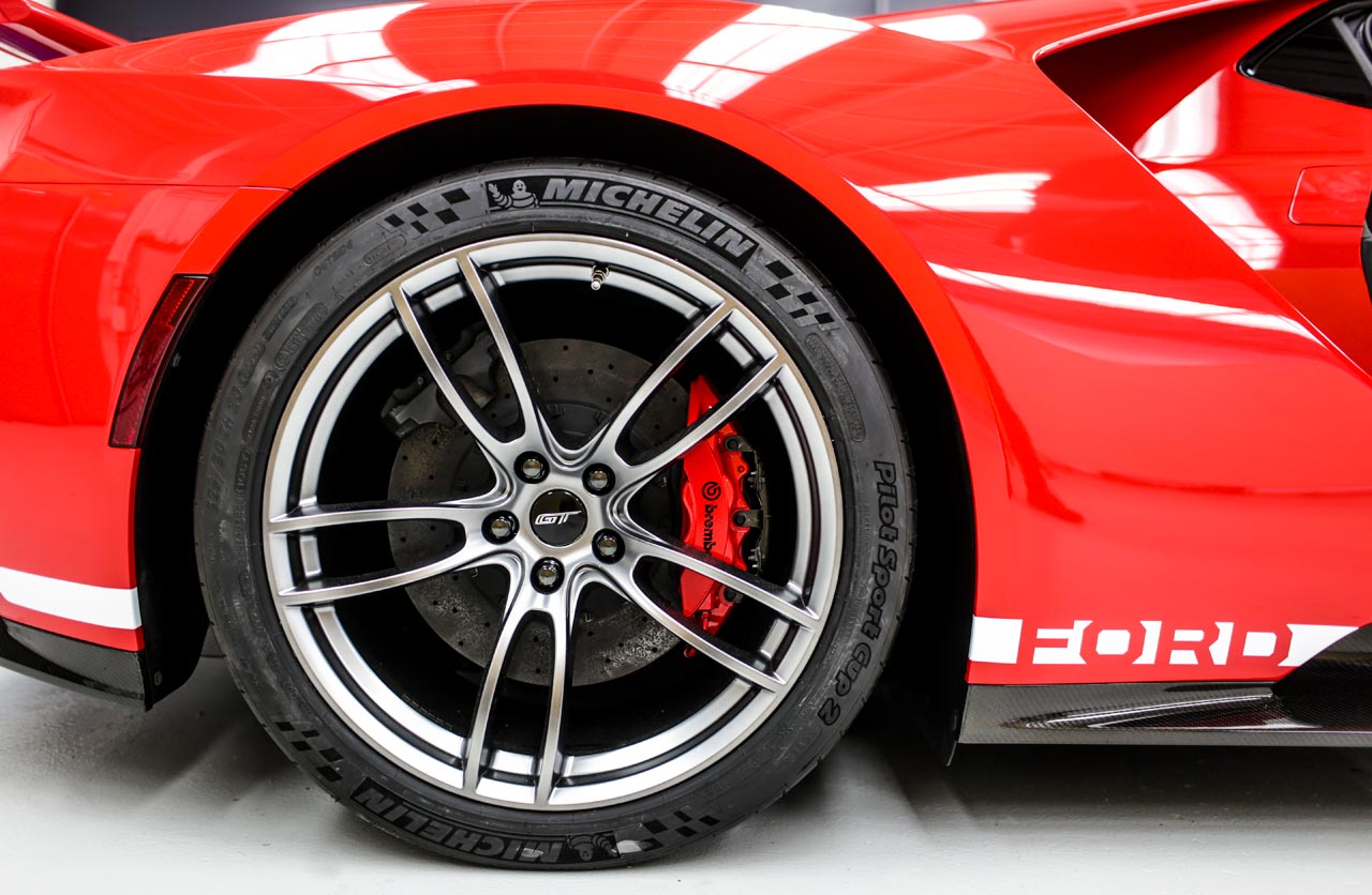 El Ford GT ’67 Heritage posee ruedas de aluminio forjado en pieza única, de 20 pulgadas, con acabado en barniz satinado y tuercas negras. Además, cuenta con pinzas de freno rojas y cubiertas de los retrovisores plata, que completan el innovador diseño exterior.