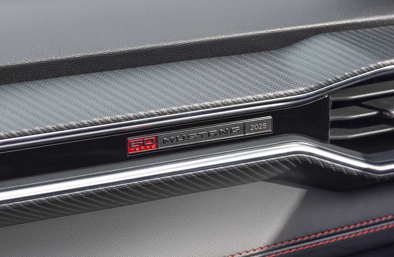 Las novedades continúan en el interior, donde el Mustang conmemorativo permite elegir entre los tonos gris, negro y rojo, que están acompañados por una placa especial ubicada en el panel de a bordo.