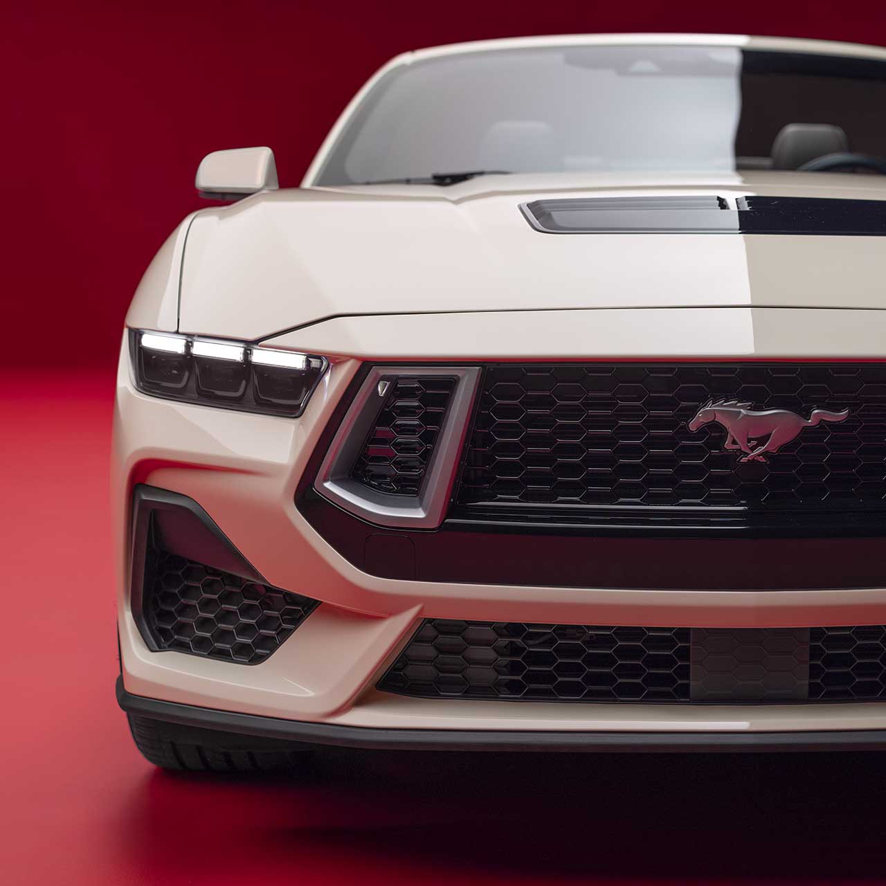 En su exterior, la nueva configuración de este Mustang tiene una zona delantera con una flamante parrilla con un exclusivo diseño de malla -que recuerda al modelo de 1964- y con la presencia del color plateado.