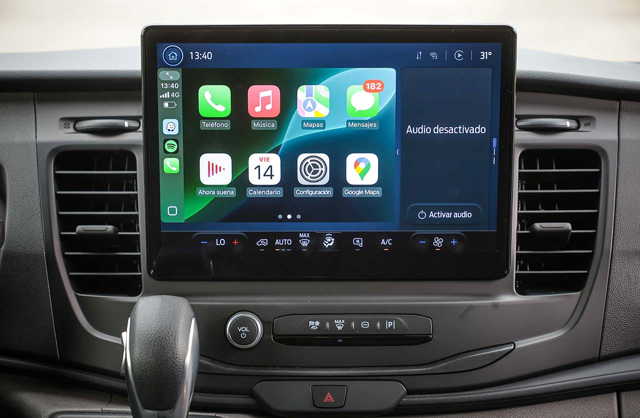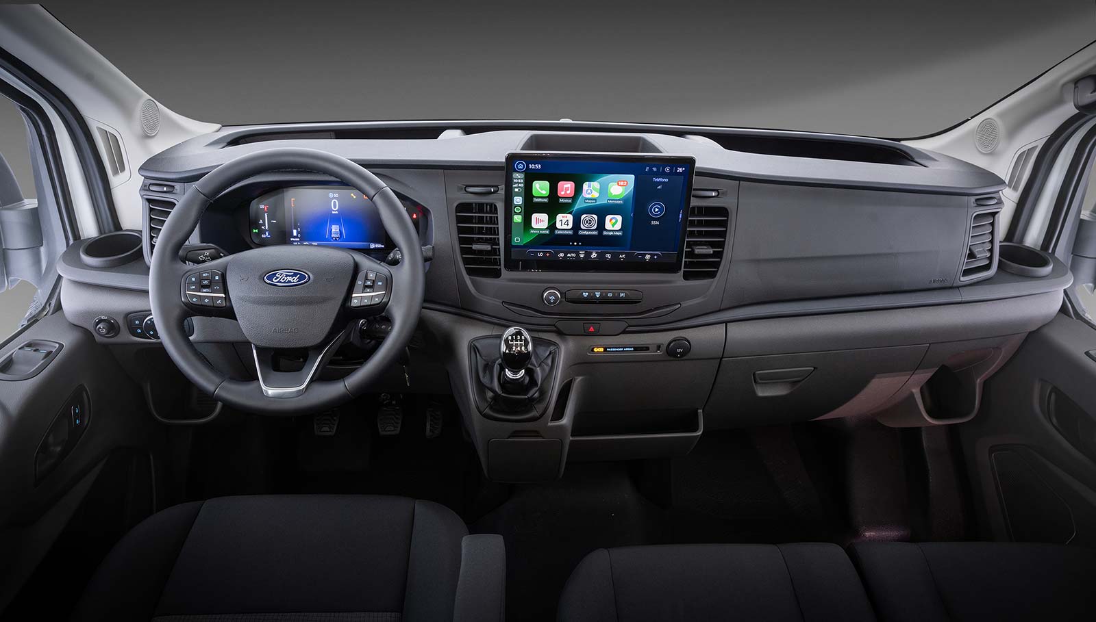 El equipamiento incluye volante multifunción con cuero, freno de mano eléctrico, asientos reclinables (en Minibus), espejos plegables eléctricamente, SYNC IV con conectividad inalámbrica con Apple CarPlay y Android Auto, pantalla táctil de 12”, tablero digital de 8”, cargador inductivo y acceso manos libres, arranque con botón y modem 4G (para la aplicación FordPass).