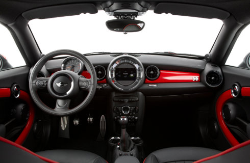 El habitáculo, tal como es usual en los modelos de la marca, cuenta con un instrumental central de grandes dimensiones y con un cuentarrevoluciones posicionado justo detrás del volante. Los asientos deportivos de serie ofrecen una excelente sujeción lateral, por lo que facilitan la conducción deportiva en caminos sinuosos. Independientemente de los colores de carrocería que escoja el cliente, el color que impera en el habitáculo del MINI Coupé siempre es Carbon Black.