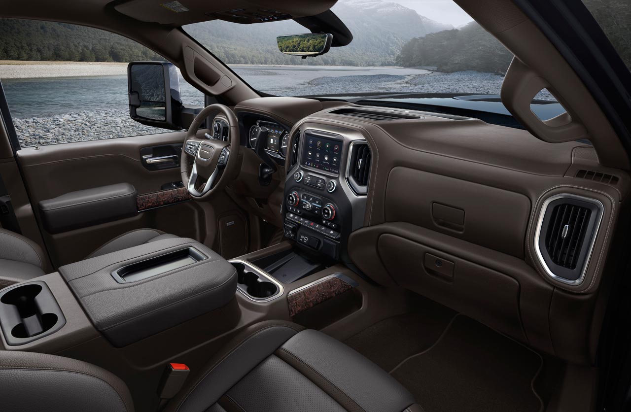 El equipamiento de la GMC Sierra Heavy Duty 2020 tiene controles de ascenso y descenso en pendientes, sistema de selección de tracción con modo Off-Road, Head-Up Display de 15 pulgadas con inclinómetro todo terreno, freno de estacionamiento eléctrico automático, dirección con asistencia variable y controles de frenos y balanceo de remolque.