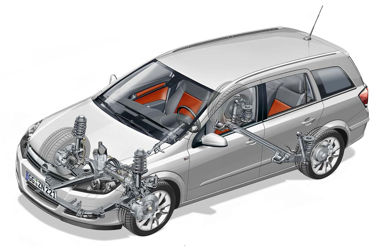 El chasis del Opel Astra H es extremadamente sencillo. En la parte delantera montantes MacPherson, y en la parte trasera una viga habitual.