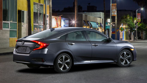 El Civic sedán sorprendió a todos con su gran cambio exterior, comenzando por un frontal agresivo con parrilla cromada horizontal y ópticas con tecnología LED y una imagen lateral representada por la caída del techo al estilo fastback, más propio de una cupé, lo que desemboca en una zona trasera deportiva y con luces con forma de C e integradas en el baúl.