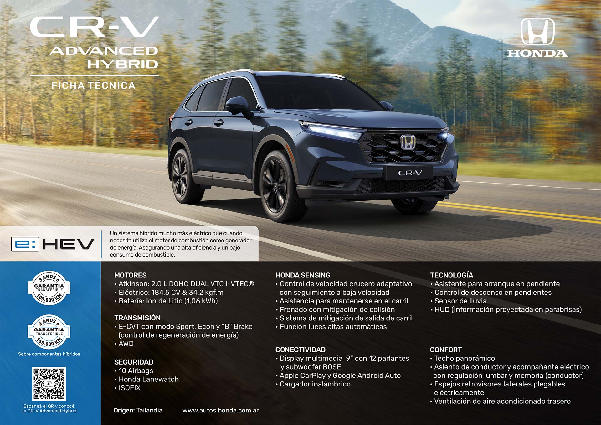 La CR-V híbrida será lanzada en el país en octubre con un sistema con motor 2.0 Atkinson de 148 CV y 183 Nm y eléctrico de 184,5 CV y 335 Nm. Además, posee caja E-CVT (electrónica) con modo de regeneración de energía, mientras que la tracción es integral.
