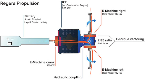 La particularidad de este sistema es la presencia del Koenigsegg Direct Drive, o simplemente KDD, un sistema de transmisión directa de la potencia a las ruedas, sin caja de velocidades y con un embrague electrohidráulico en su reemplazo; la marca anuncia una ganancia en eficiencia, ya que se reducen en más del 50% las pérdidas de potencia respecto de una transmisión CVT tradicional.