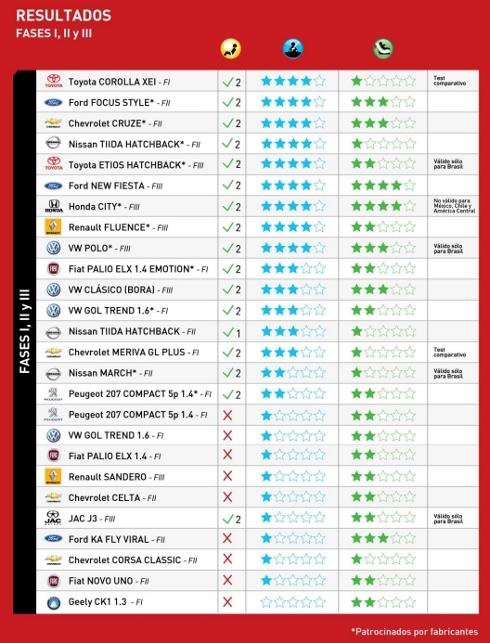 Los modelos que cuentan con cuatro estrellas son el Ford NEW Fiesta KD, Honda City, Renault Fluence, Toyota Etios hatchback y VW Polo hatchback.
