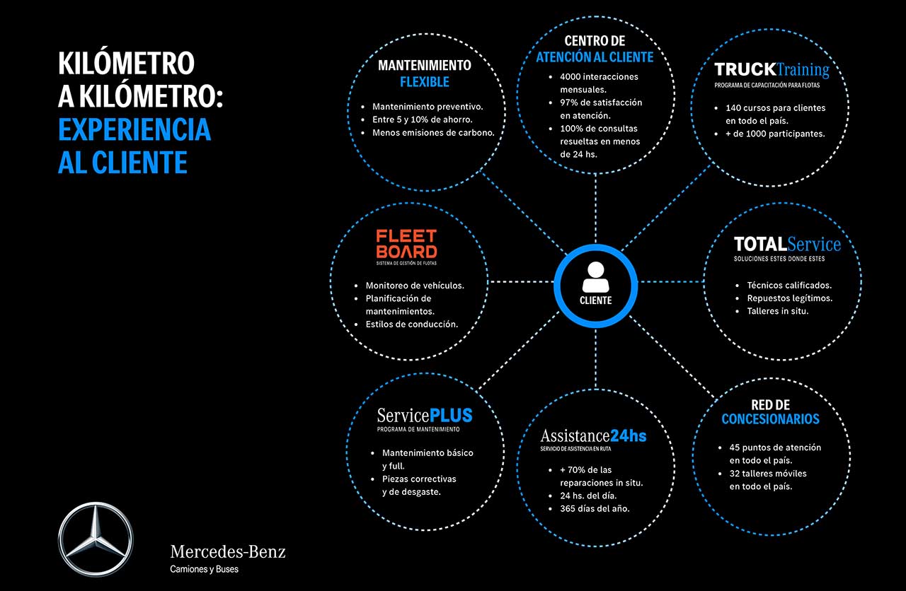 Este concepto de negocio abarca todo el proceso en la vida de los camiones y buses: red de concesionarios, venta de unidades, servicios financieros, Mercedes-Benz Plan de Ahorro, Servicios de Postventa (experiencia de cliente) y SelecTruck.