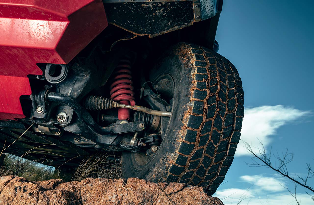 La marca japonesa también muestra la presencia de la suspensión delantera con amortiguadores de color rojo, aunque no brindó información sobre ese sistema, que tendría novedades para mejorar la conducción fuera del asfalto.