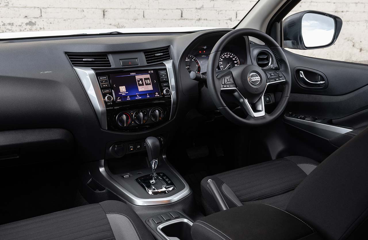 En el interior de esta Frontier hay tapizado de tela con costuras visibles, apliques de color gris, aire acondicionado manual, pantalla multimedia, selector de modos de manejo, espejo automático y volante multifunción revestido con cuero.