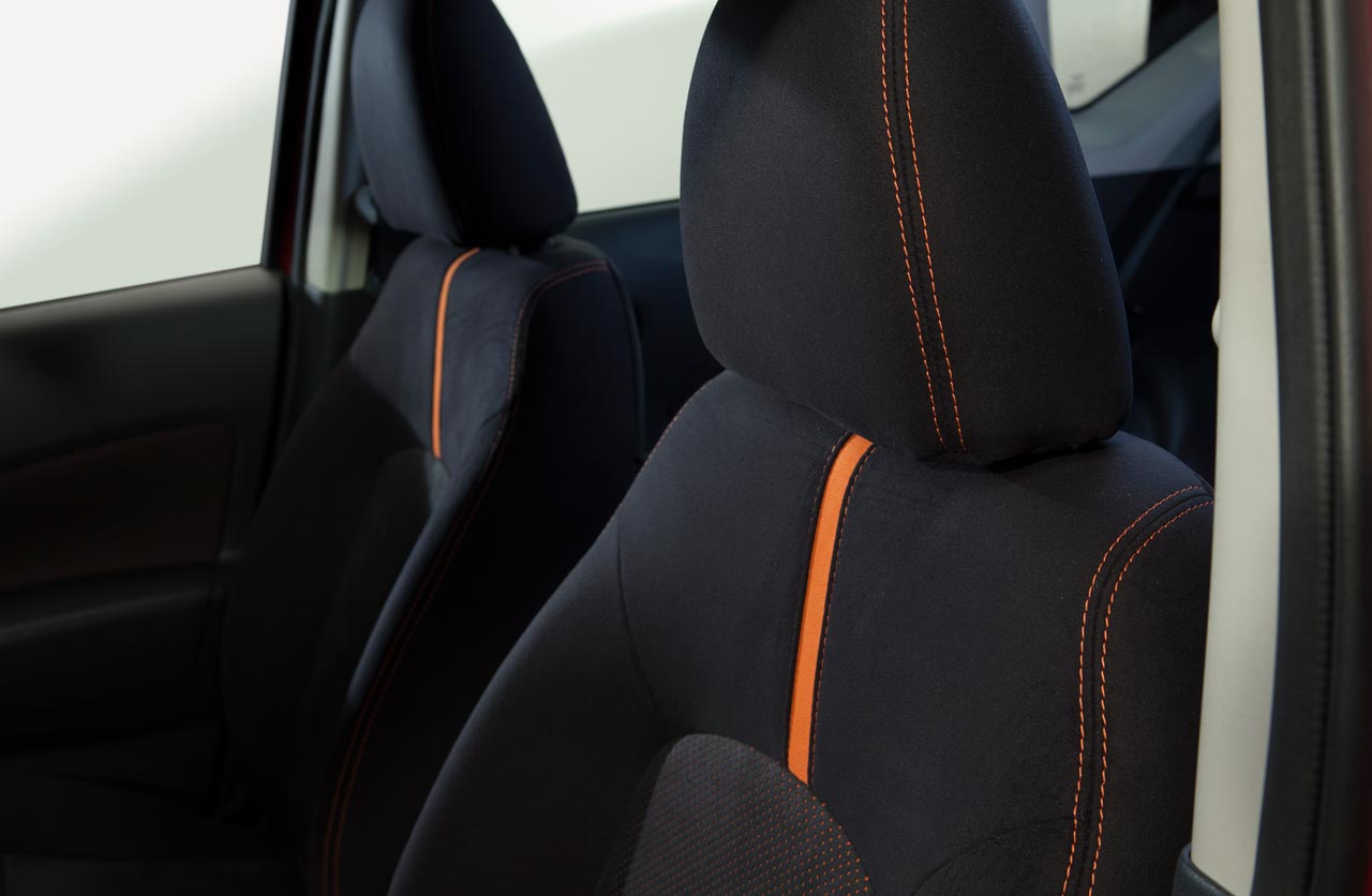 Puertas adentro, el Note cuenta con un volante forrado con cuero y cuyo diseño deportivo ha sido basado en el que posee el 370Z, además de incluir un tapizado específico con la presencia del color naranja.
