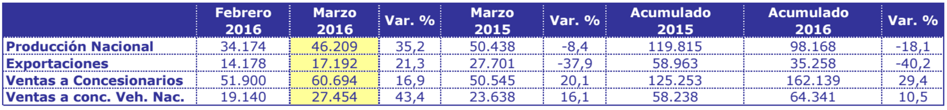Las terminales automotrices produjeron en marzo 46.209 unidades. Este volumen se ubicó un 8,4 % por debajo de las 50.438 unidades que se produjeron en marzo de 2015 y 35,2 % por sobre las 34.174 unidades de febrero anterior.