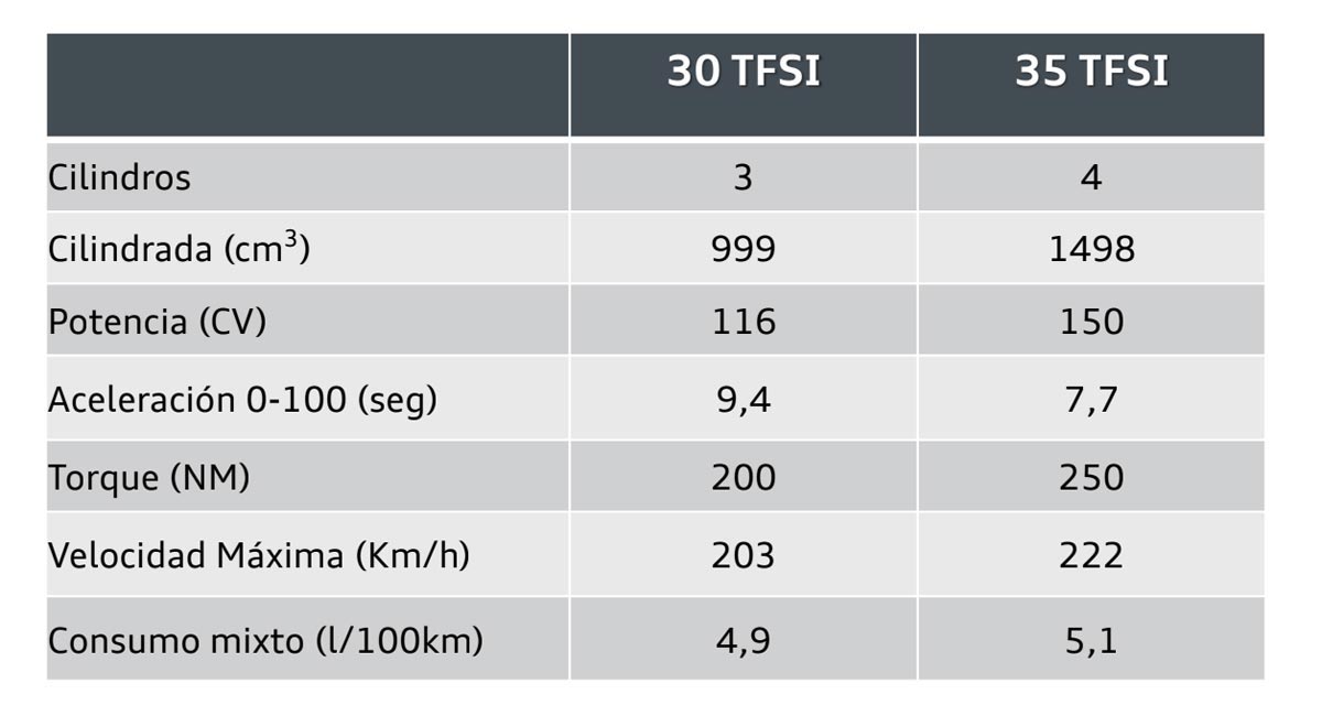 La versión de entrada de gama es la Sportback 30 TFSI que incorpora el nuevo motor de 3 cilindros 1.0 litros con inyección directa, turbocompresor y filtro de partículas que desarrolla 116 caballos y está asociado exclusivamente a la transmisión automática S tronic de 7 velocidades.