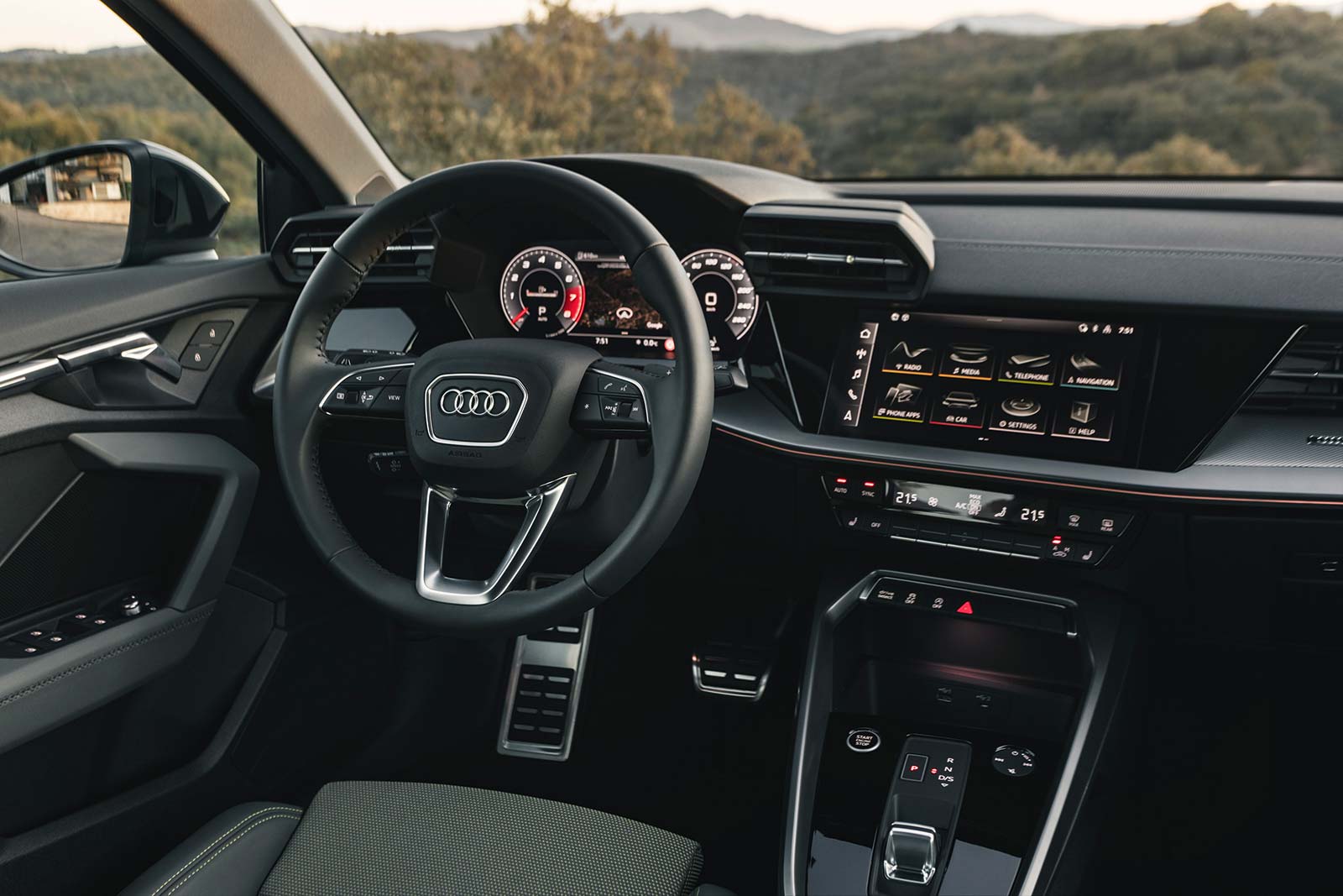 El equipamiento del A3 35 TFSI está formado por climatizador automático de dos zonas, Keyless Go, volante multifunción con levas y cuero, seis airbags, cámara posterior, sensores delanteros y traseros con asistente de estacionamiento, luces LED delanteras (excepto los intermitentes), rueda de auxilio temporal y freno de estacionamiento eléctrico.