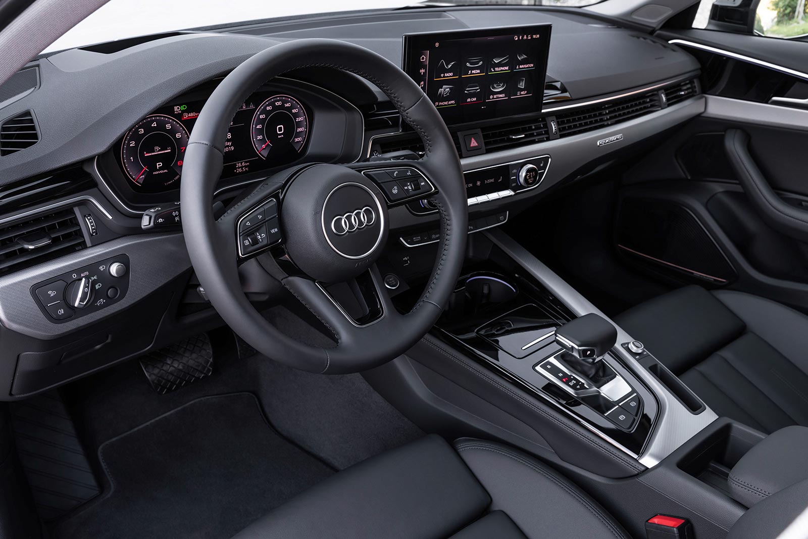 En cuanto al equipamiento, dispone de climatizador automático con tres zonas, espejos exteriores térmicos, control de voz con lenguaje natural, Audi Smartphone interface compatible con Apple y Android, navegador satelital, Audi drive select, sensores de estacionamiento delanteros y traseros, asiento del conductor con regulaciones eléctricas, Audi soundsystem, tapizado con cuero y cuero sintético, cámara de marcha atrás y Confort Key con desbloqueo del portón trasero con sensor.