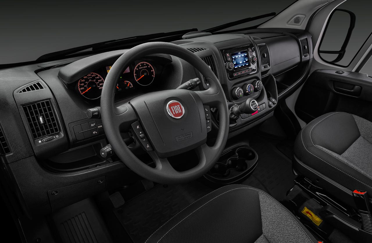 El nuevo Ducato llega con tres plazas y equipado con aire acondicionado, cierre centralizado de puertas, dirección hidráulica, levantavidrios eléctricos delanteros, espejos eléctricos y con calefacción, volante regulable en altura, limitador de velocidad y sistema multimedia Uconnect con USB, pantalla táctil de 5 pulgadas y navegador.