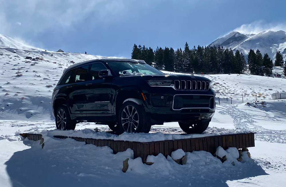 Exhibido en el centro de esquí cuyano, el SUV con cinco plazas (también hay un Grand Cherokee L con siete asientos) muestra su nuevo diseño presentado por primera vez en 2021. En el sector frontal combina la clásica parrilla con siete orificios de la marca con un nuevo estilo para las ópticas.