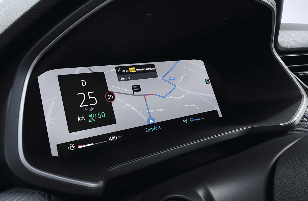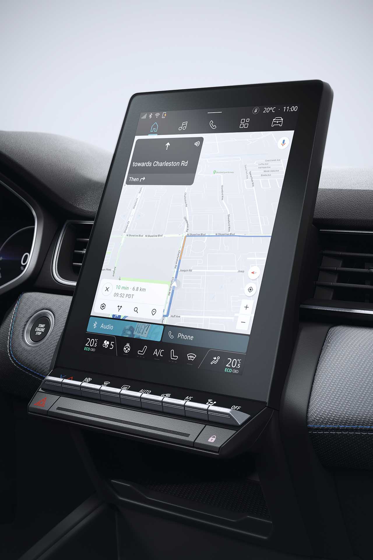En el interior de este Captur hay un nuevo tablero totalmente digital de 10,25 pulgadas que se combina con el flamante sistema multimedia openR link, con pantalla táctil vertical de 10,4 pulgadas e integración de Google.