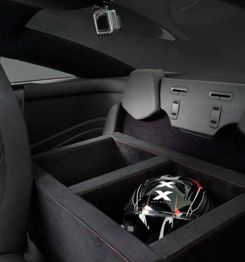 También hay una pantalla táctil de 7″ para el acompañante que se encarga de emitir las imágenes tomadas con dos cámaras GoPro, una de ellas ubicadas en la parte posterior del interior. En esa zona donde además hay un cajón para guardar los cascos, en la ubicación natural de los asientos traseros.