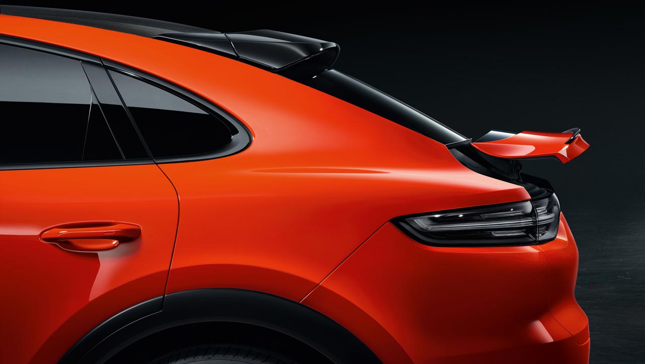 Las novedades más importantes están en la parte trasera, donde tiene un techo 20 milímetros más bajo que además ostenta una marcada caída. Está acompañado por dos spoilers: uno en el techo y otro inferior que es activo, lo que brinda la posibilidad de variar la aerodinámica para un mejor comportamiento. Además, tiene el espacio para la patente en el paragolpes (en el Cayenne está en el portón).